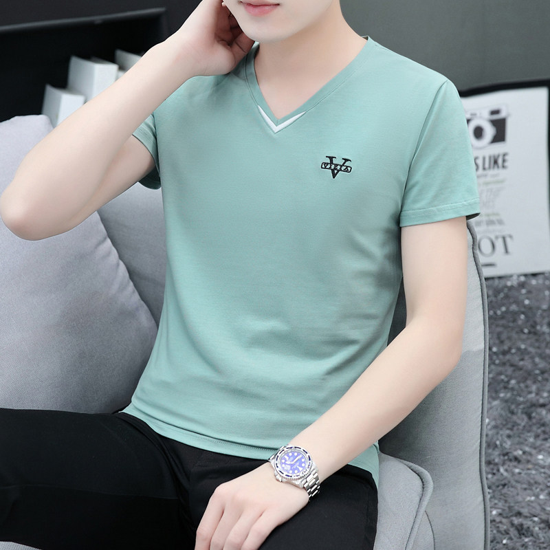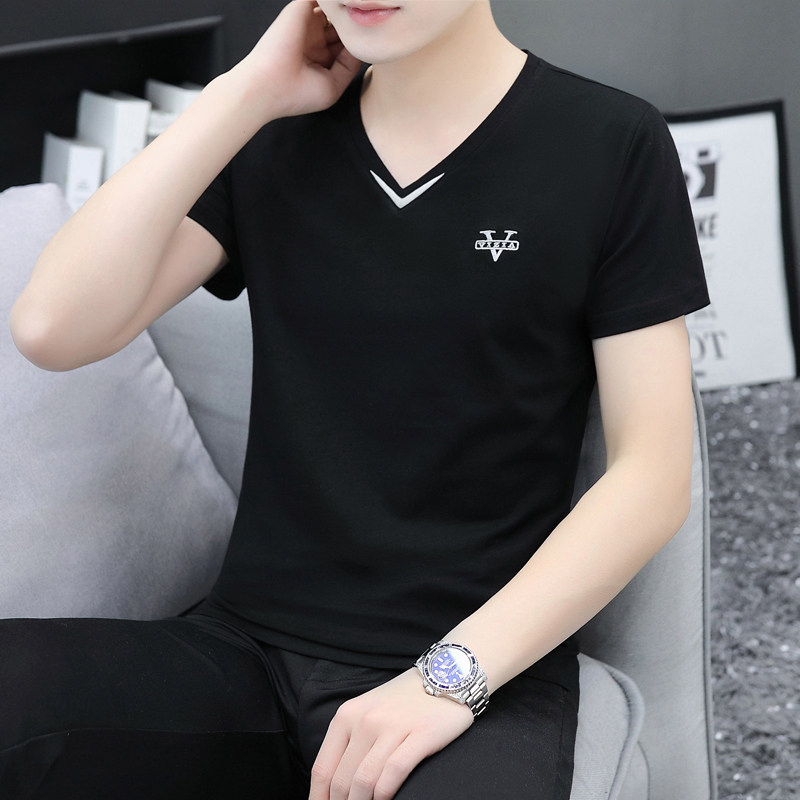 刺绣双V领纯棉短袖t恤男夏季潮流韩版纯色简约POLO半袖流行打底衫