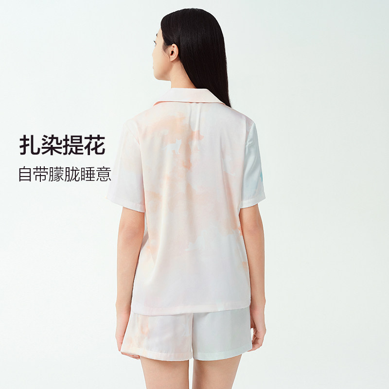 爱美丽彩云猫咪月光丝清爽翻领睡衣开衫短袖短裤春夏家居服套装女