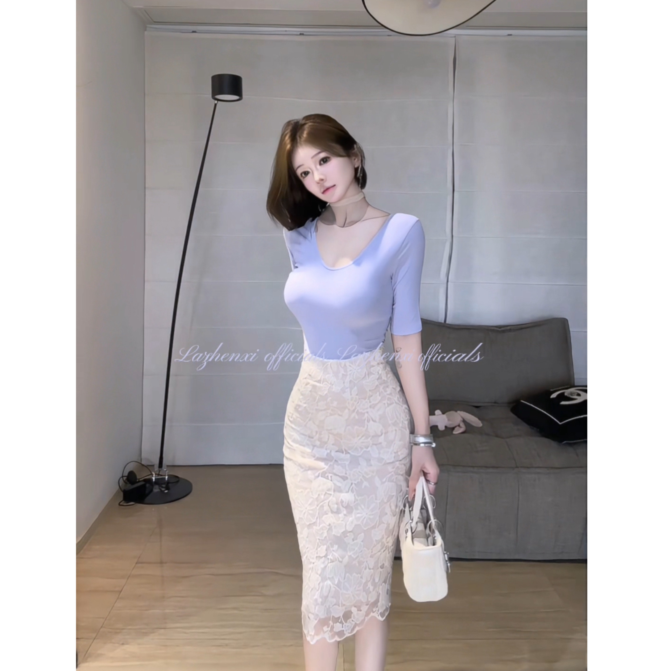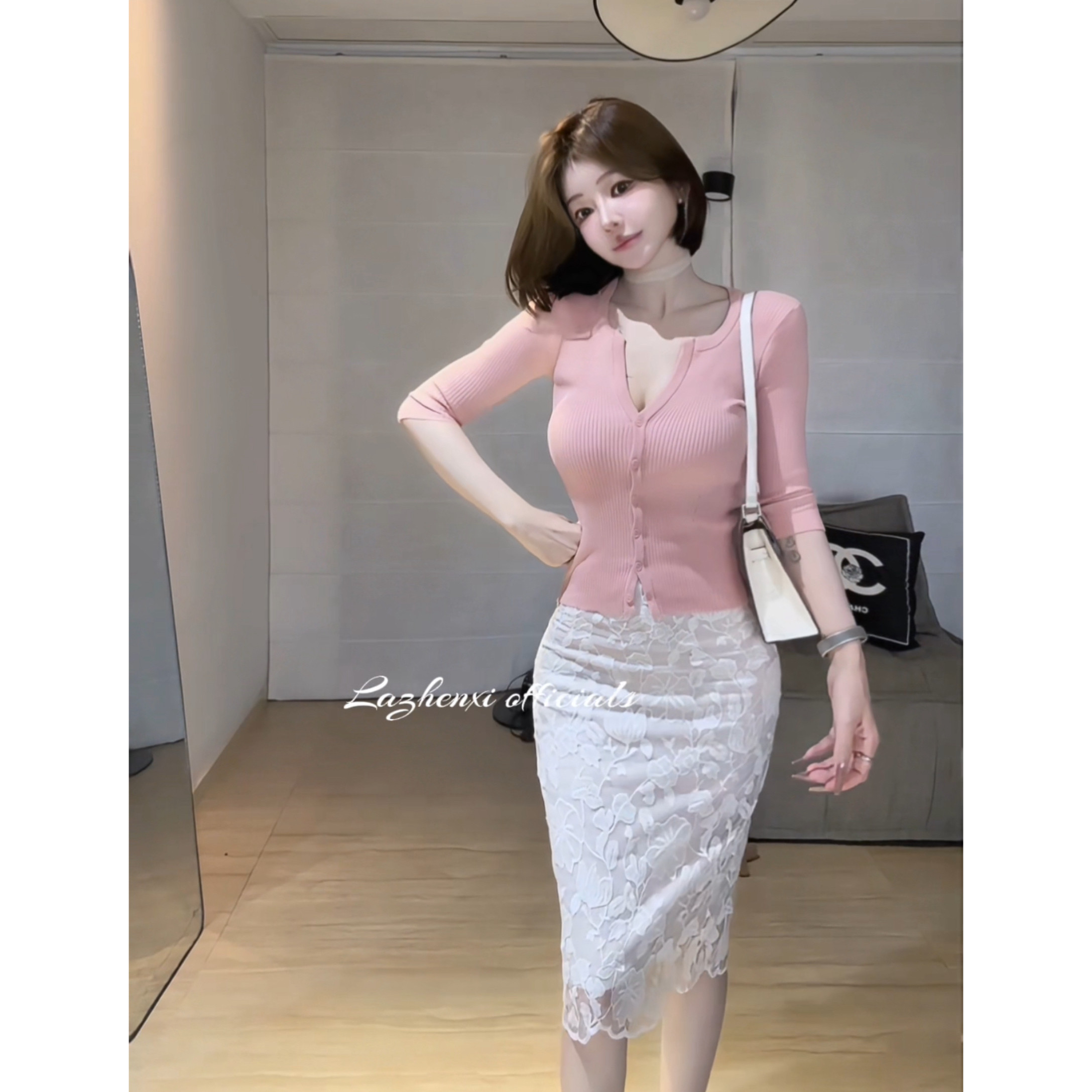 希野逸儿/江南美人穿搭 高腰蕾丝包臀立体雕花米杏色半身裙女人味