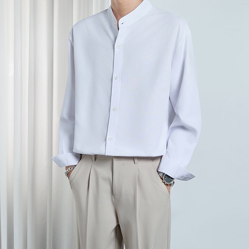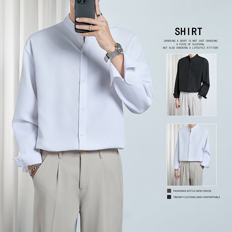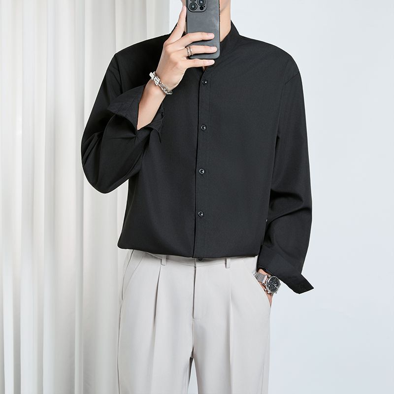 春夏新款立领黑色衬衫长袖男士高级感商务休闲上班婚礼白色衬衣