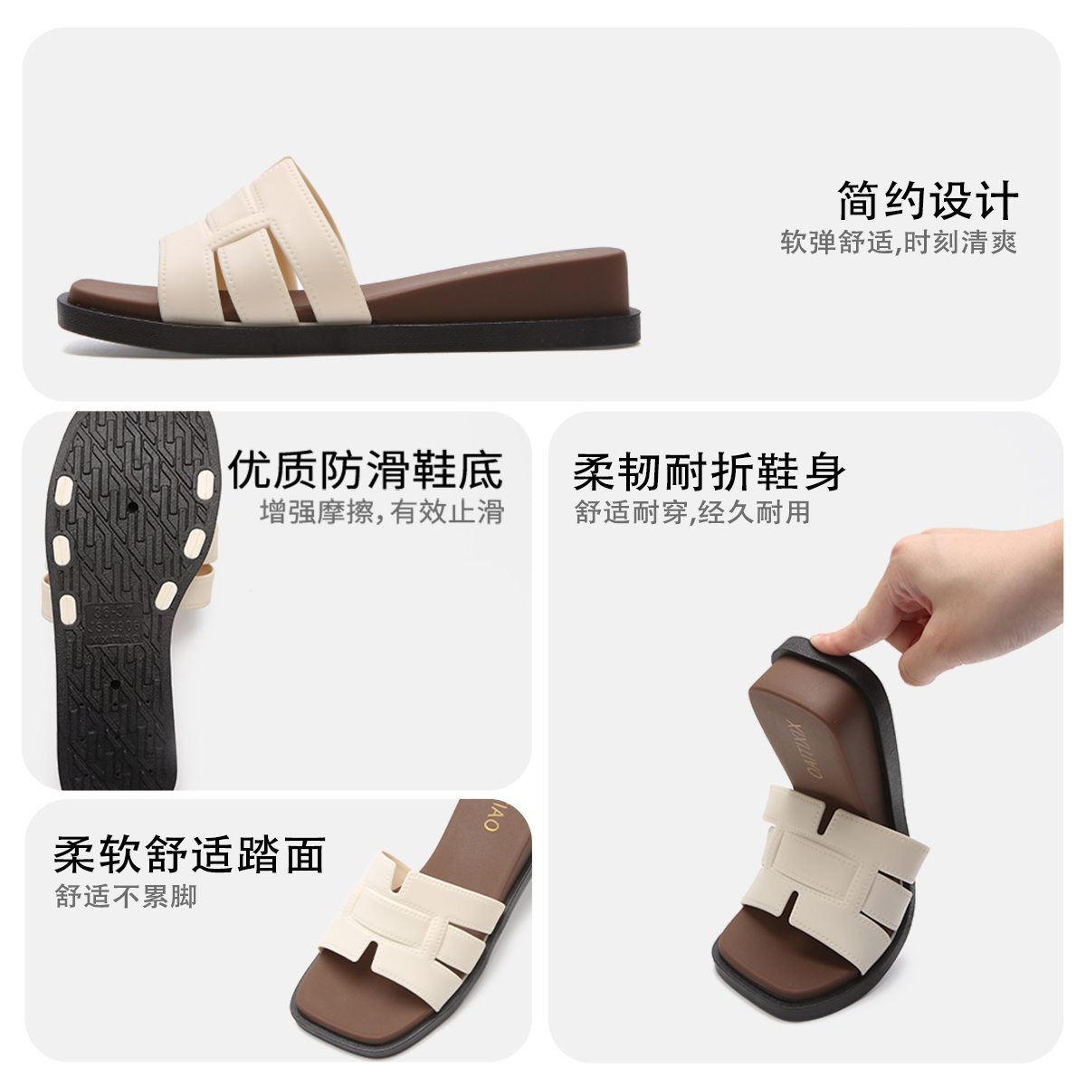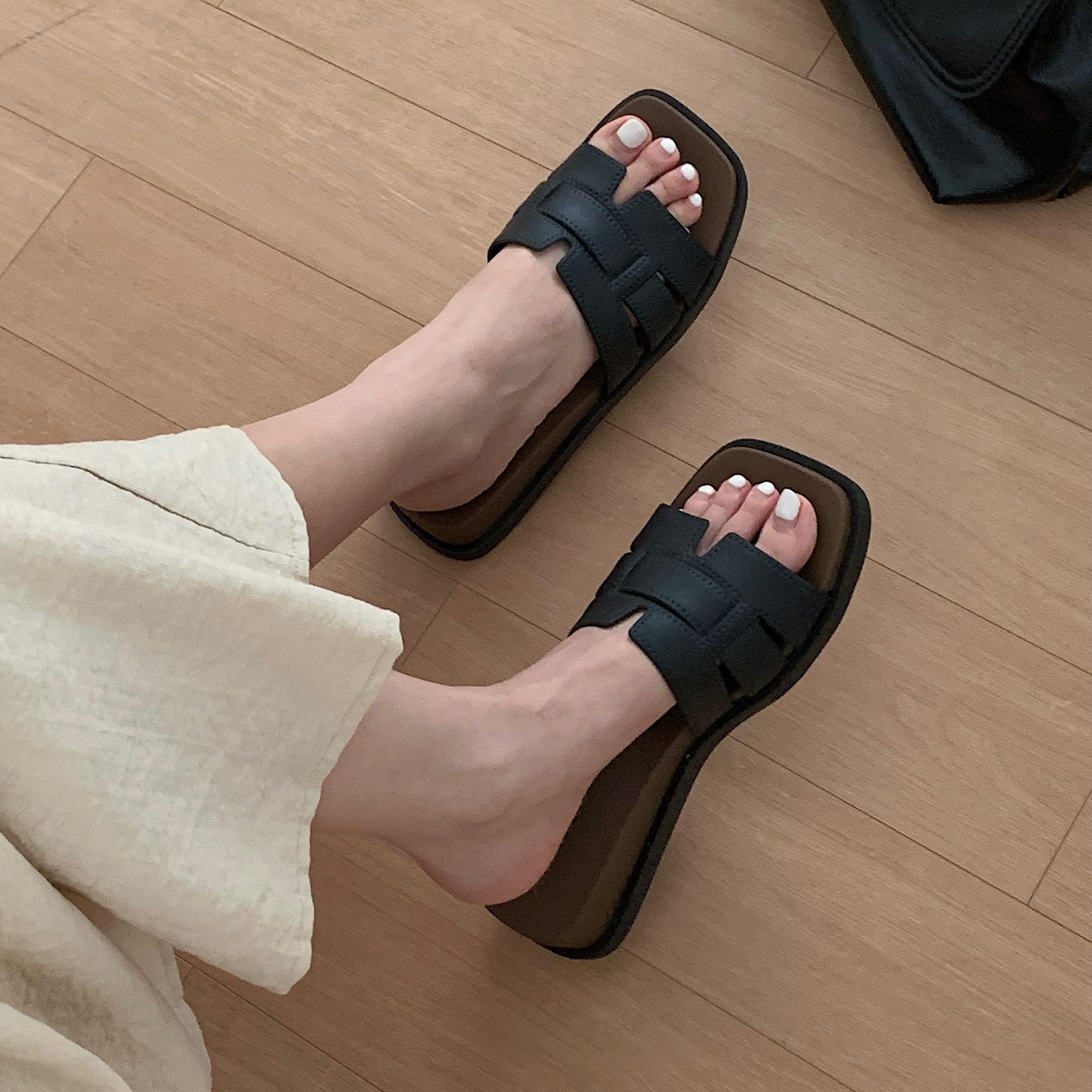 简约方头坡跟拖鞋舒适女士软底一字网红新款夏防滑百搭拼色凉拖鞋