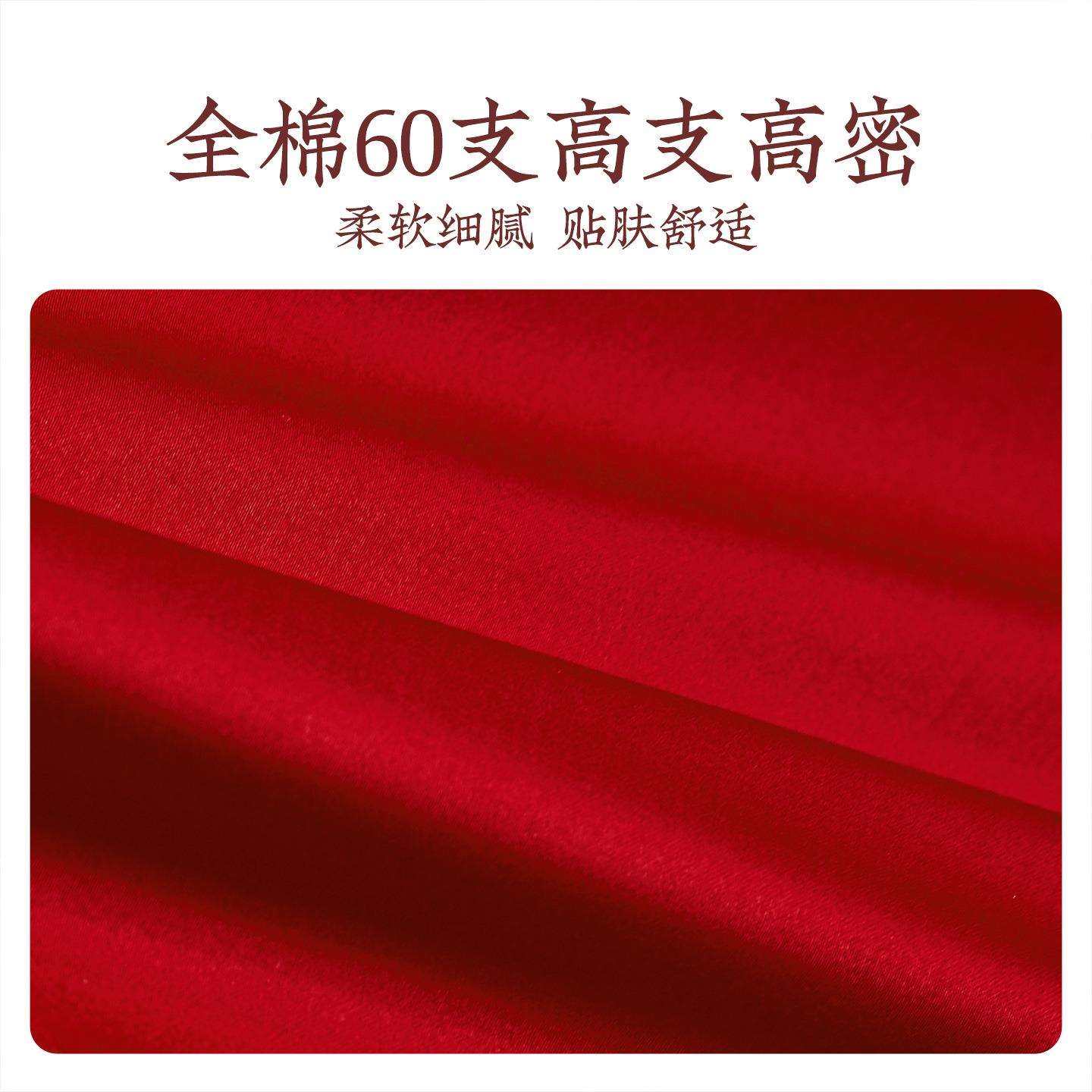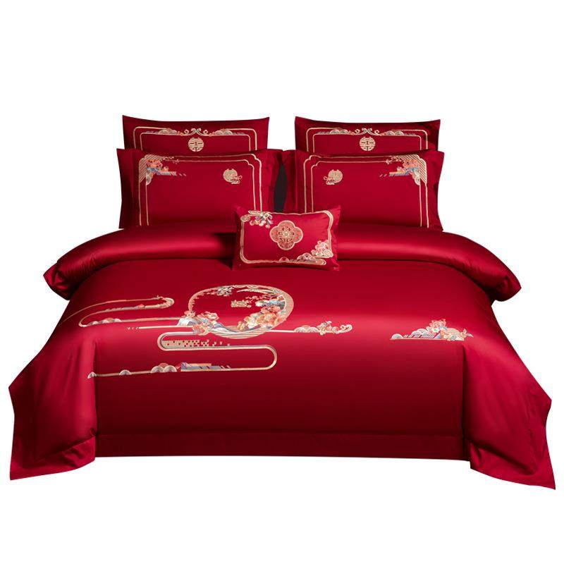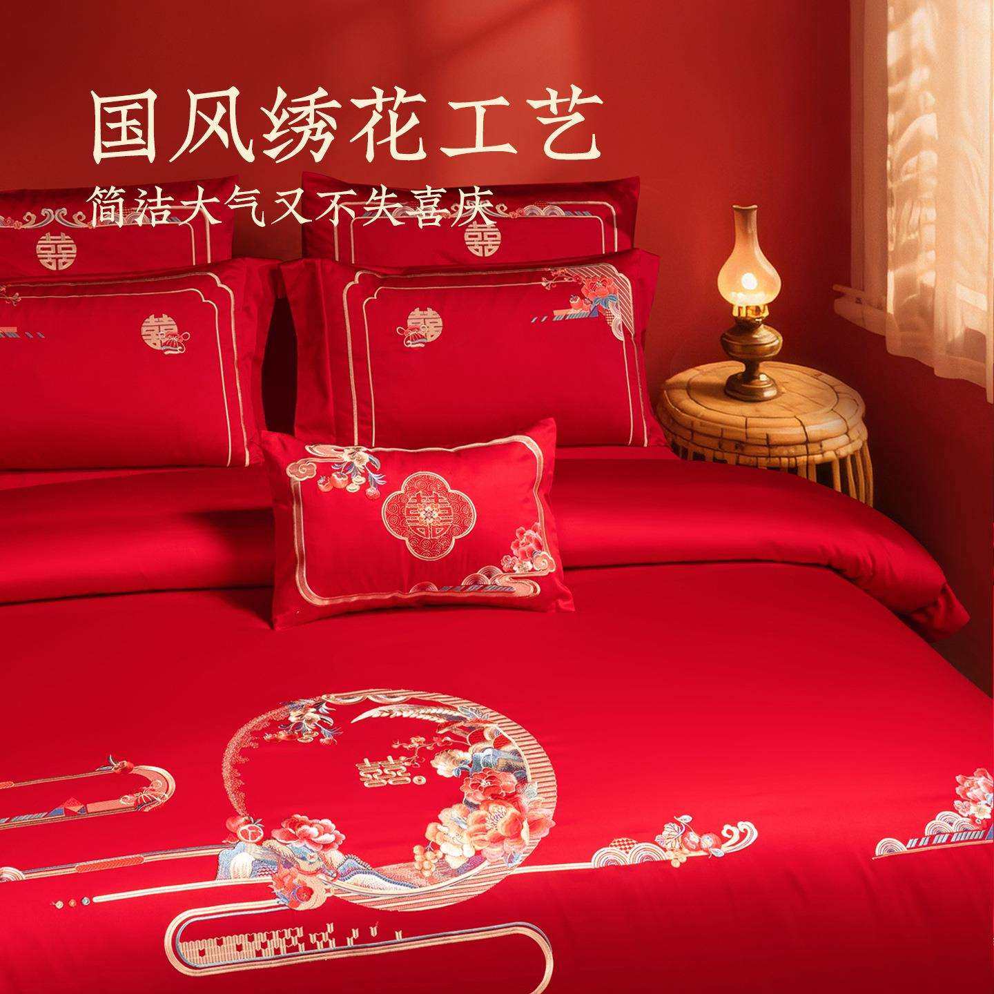 远梦婚庆四件套全棉60支贡缎刺绣床单式纯棉被套新中式结婚庆用品