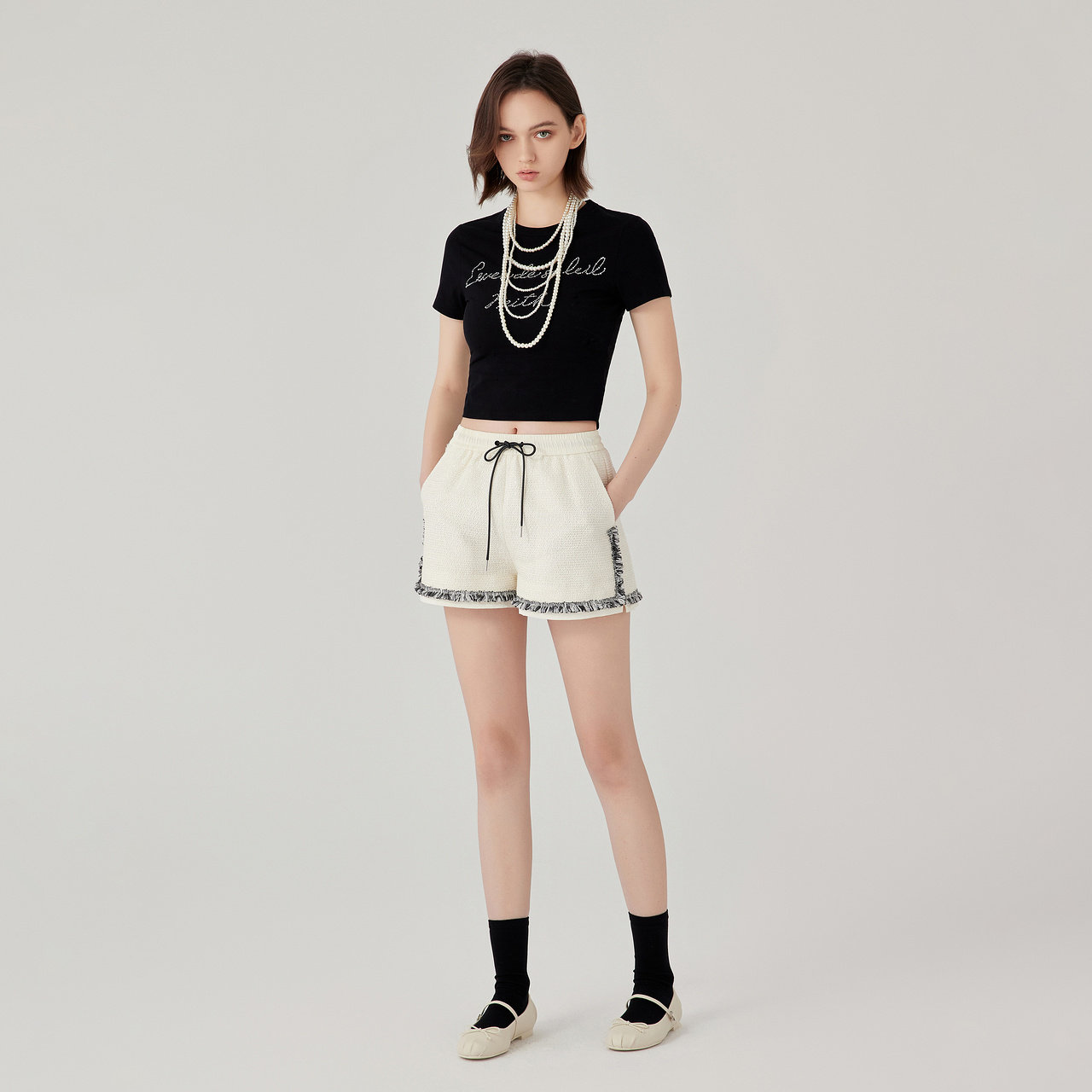 休闲毛边设计粗花呢短裤