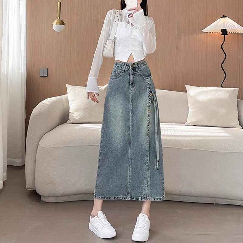 胖mm大码女装国风开叉半身裙女高腰显瘦飘带设计感新中式牛仔长裙