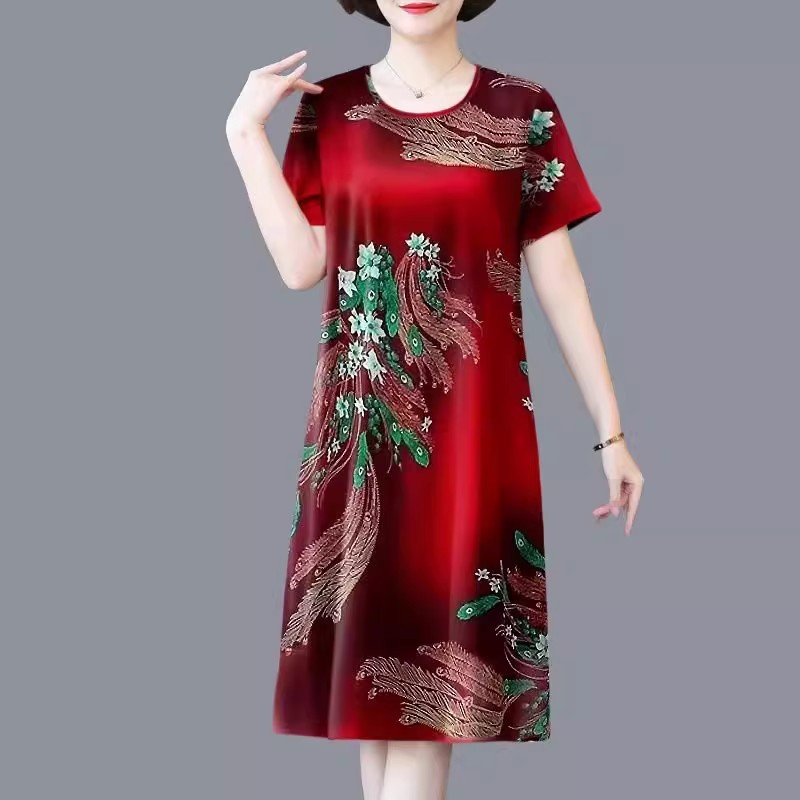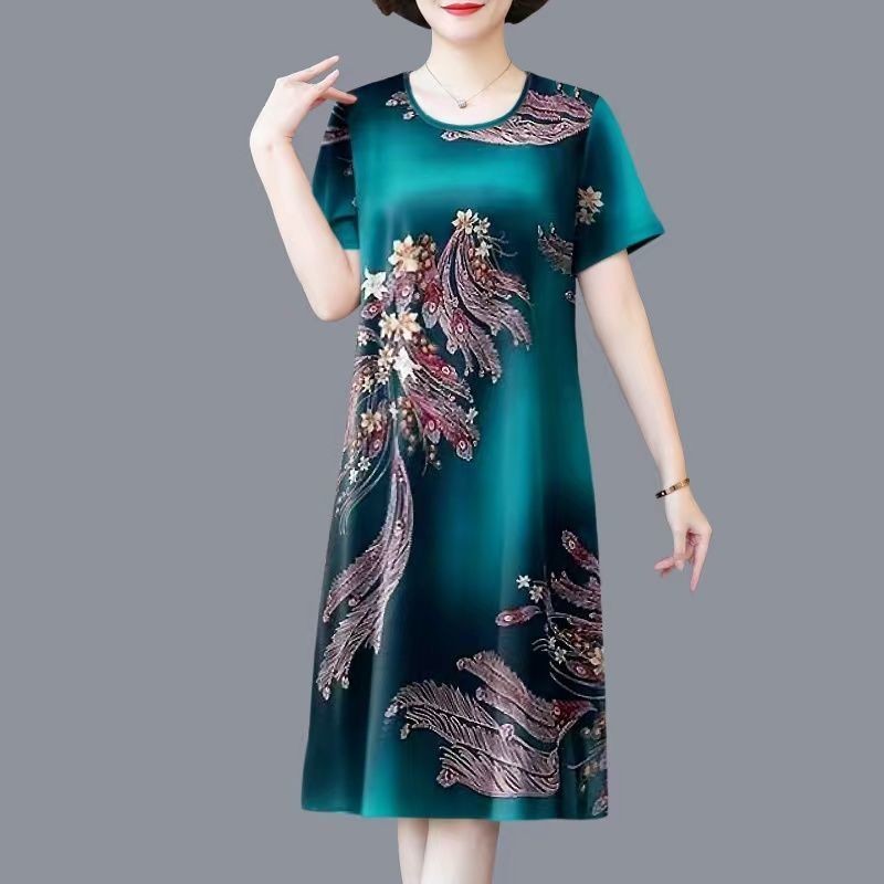 中老年妈妈装印花连衣裙2023夏季新款大码宽松短袖遮肚高档中长裙