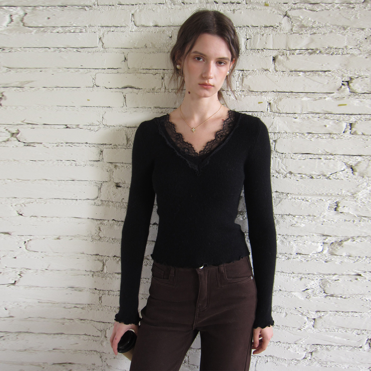 竹依依抗起球纤维套头v领蕾丝边毛衣女冬黑/白色修身打底上衣均码