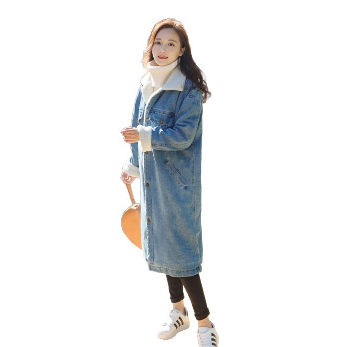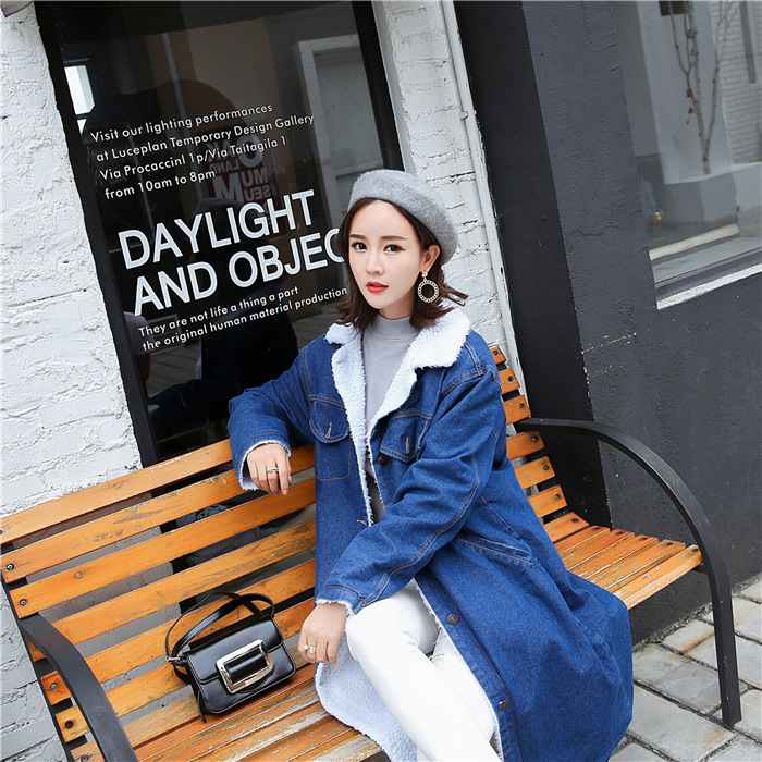 2025冬装韩版宽松大码翻领羊羔毛牛仔外套女中长款加绒加厚棉衣