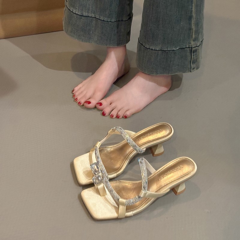 法式水钻人字拖鞋女2025夏季新款仙女风细跟凉拖鞋子夹趾高跟凉鞋