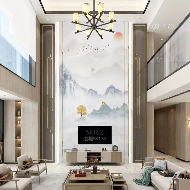 大理石电视背景墙瓷砖2024新款岩板挑空客厅别墅复式新中式影视墙