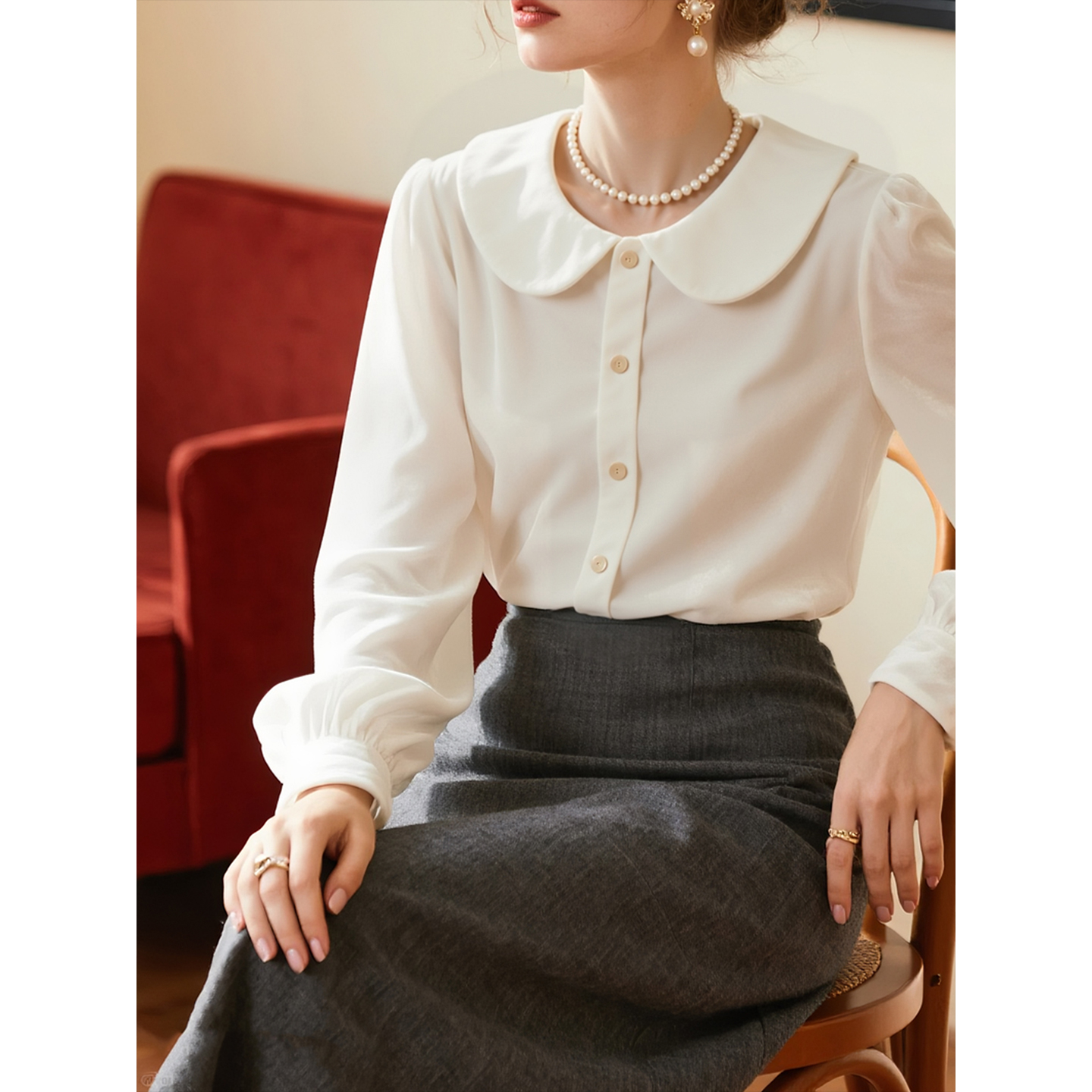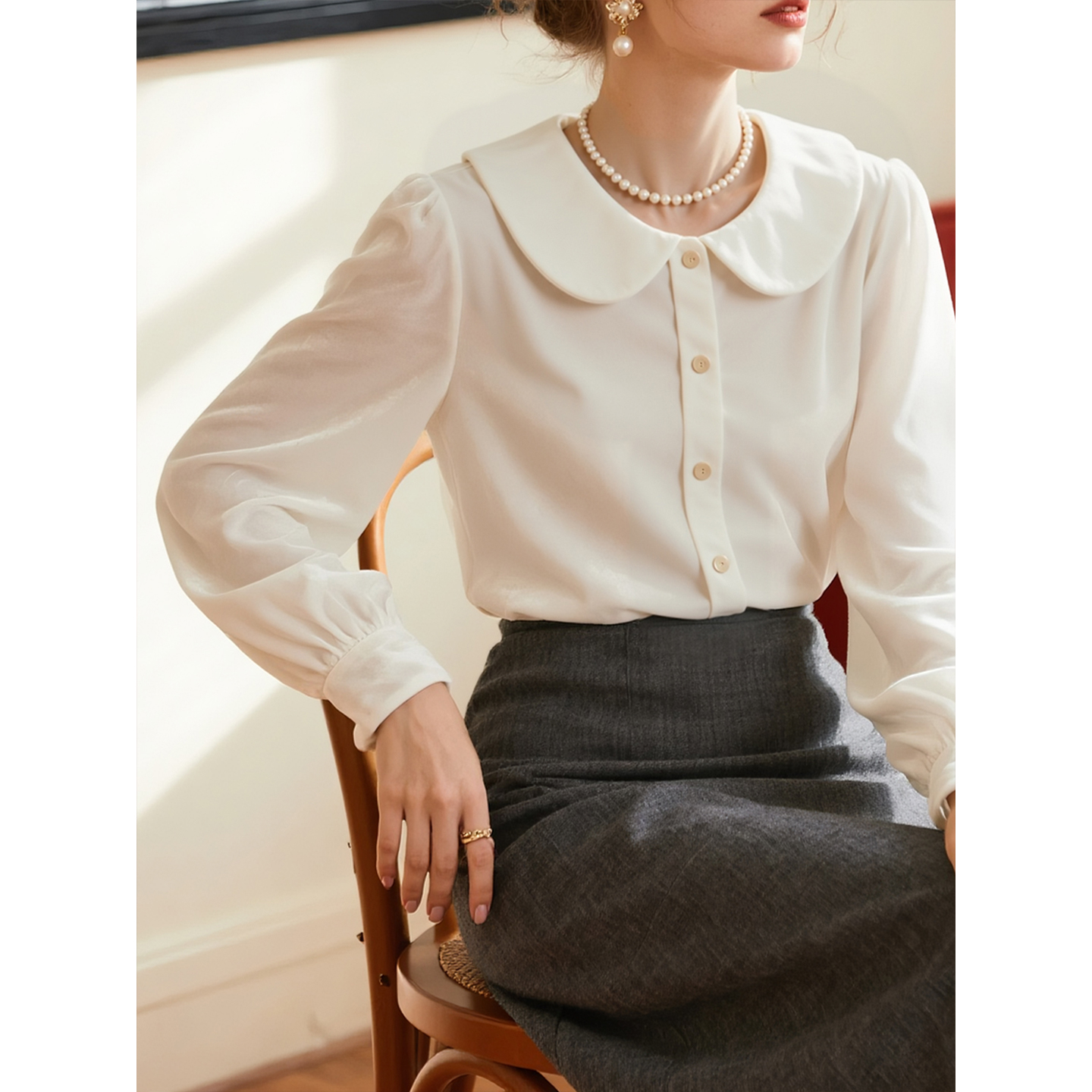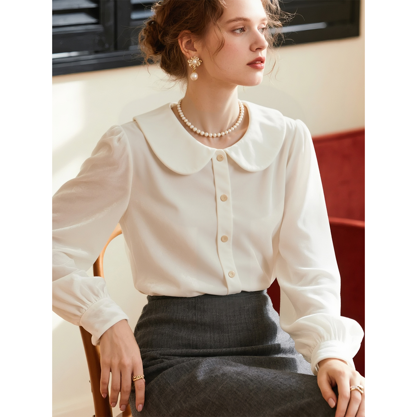 白色娃娃领长袖丝绒衬衫女2025年秋冬新款复古优雅甜美宽松衬衫