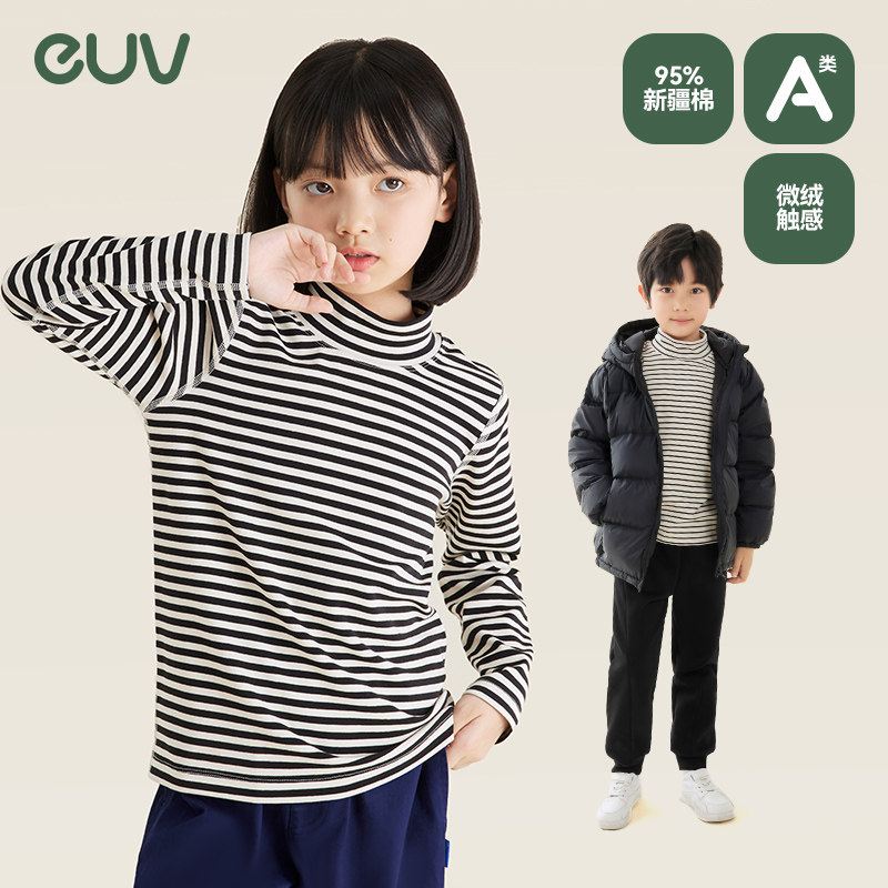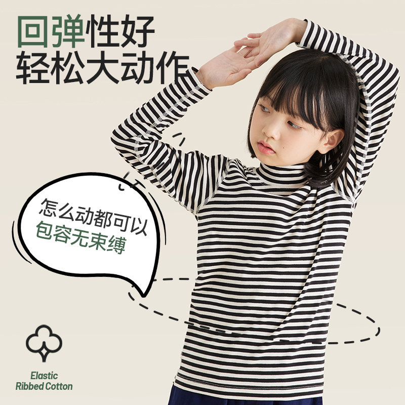 euv 儿童半高领打底衫女童黑白色条纹长袖t恤男童纯棉a类内搭秋衣