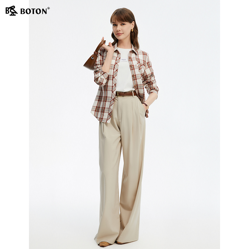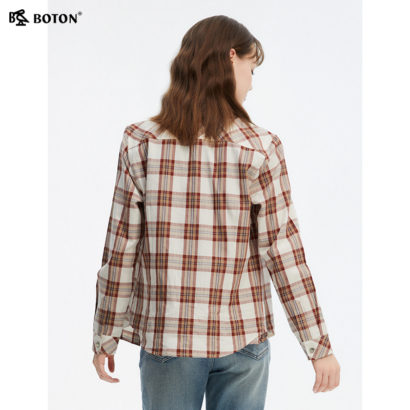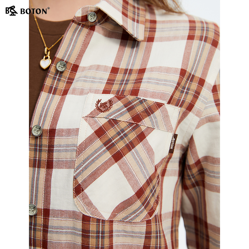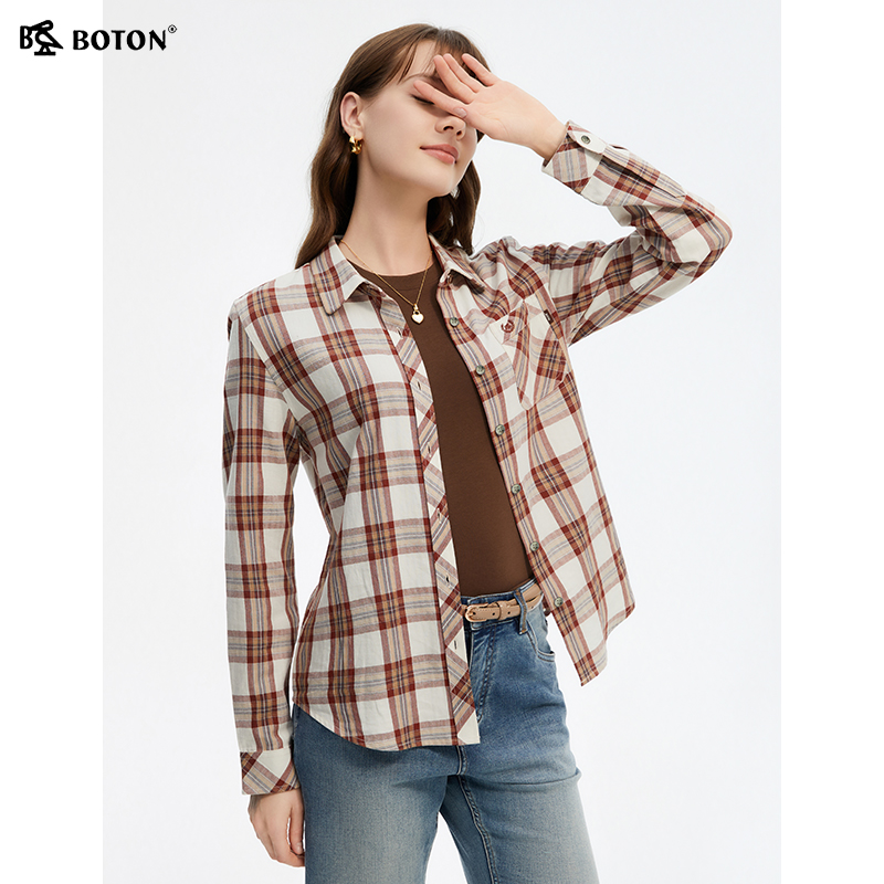 波顿2025年春夏季新款女士长袖咖杏色格子衬衫高端美式休闲衬衣