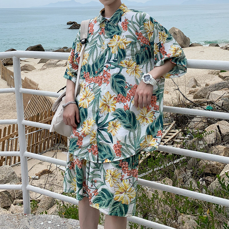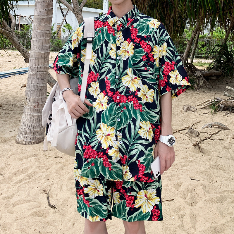 休闲夏威夷衬衫短裤夏季潮流宽松短袖日系大码海边情侣沙滩套装男
