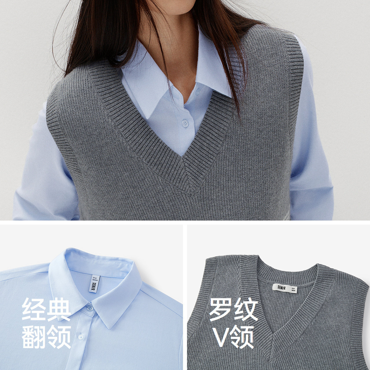 商场同款|森马长袖衬衫女冬条纹V领短背心磨毛衬衣2025新款两件套
