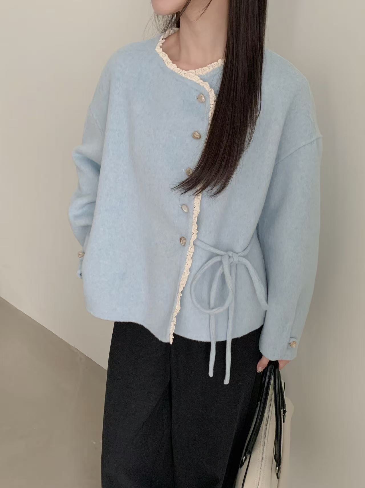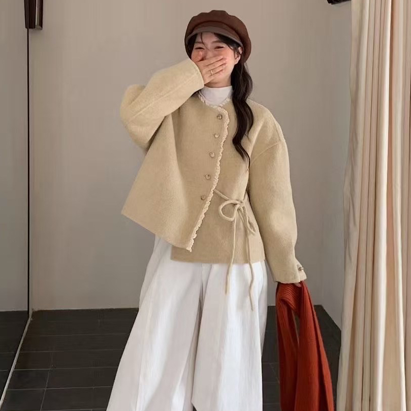2025蕾丝边羊毛呢外套女短款系带小香风双面羊绒大衣小个子韩系潮