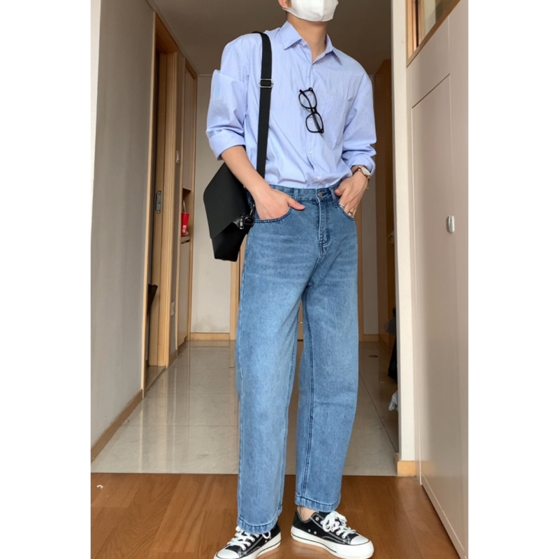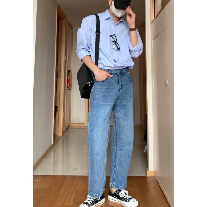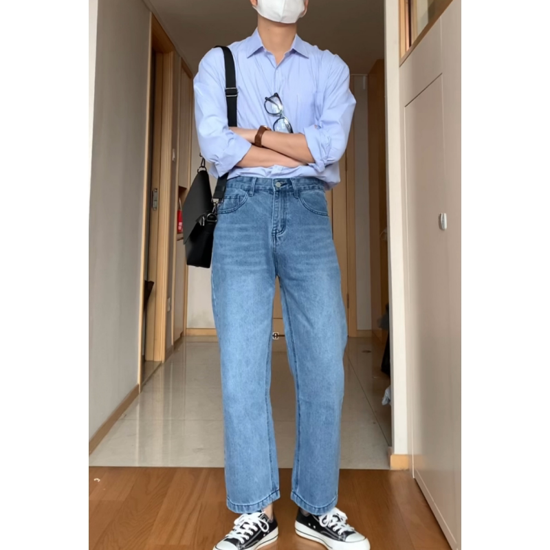 直筒牛仔裤男水洗浅蓝色显瘦长裤
