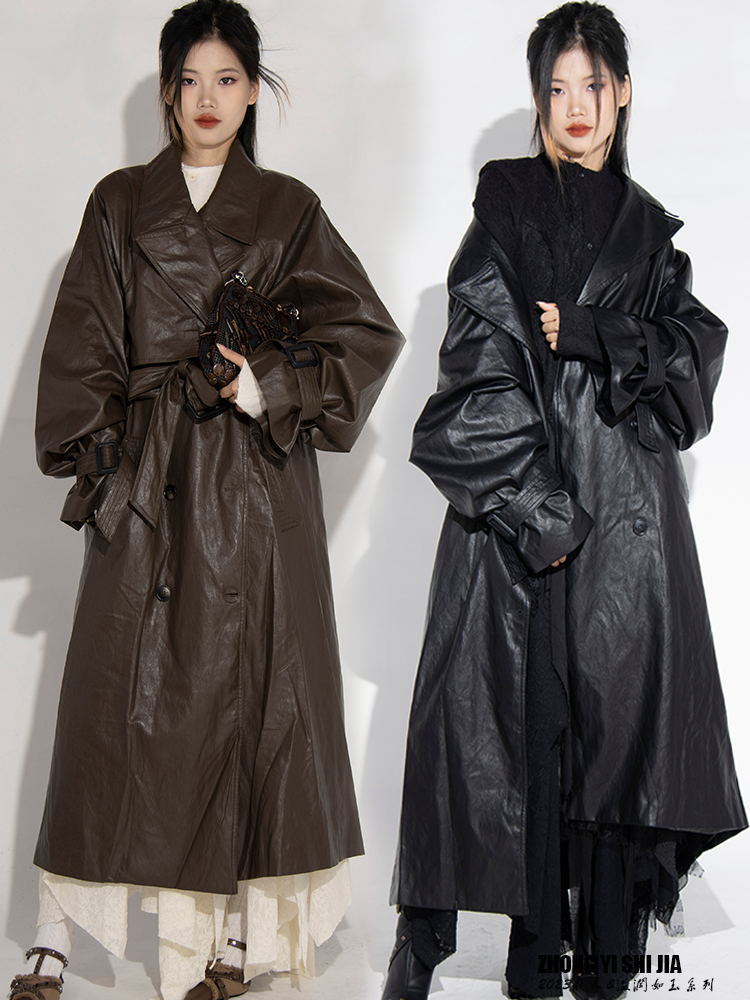 风衣外套女中长款黑色宽松高级感2023秋冬新款通勤保暖收腰皮大衣