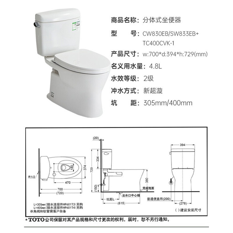 TOTO分体马桶719升级款CW830/831坐便器新款包体式超旋冲水马桶