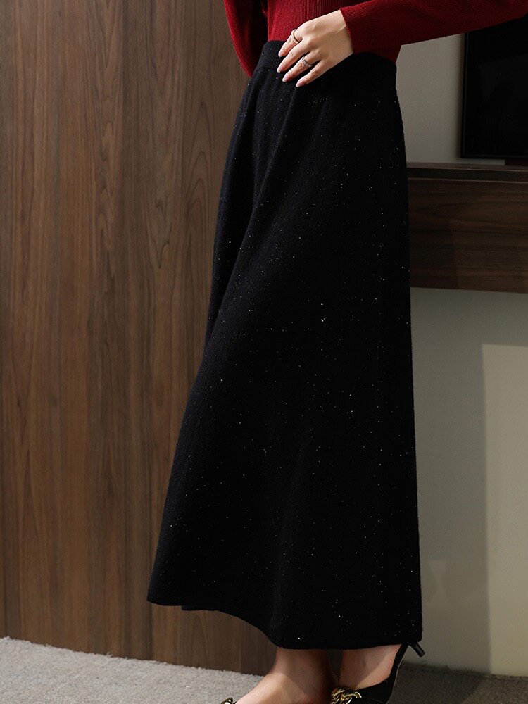 100%纯羊毛半身裙女秋冬亮丝针织裙中长款大摆裙A字裙百褶