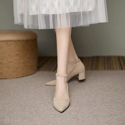 高跟鞋女粗跟5CM2024年新款百搭春夏气质名媛尖头黑色中跟单鞋女