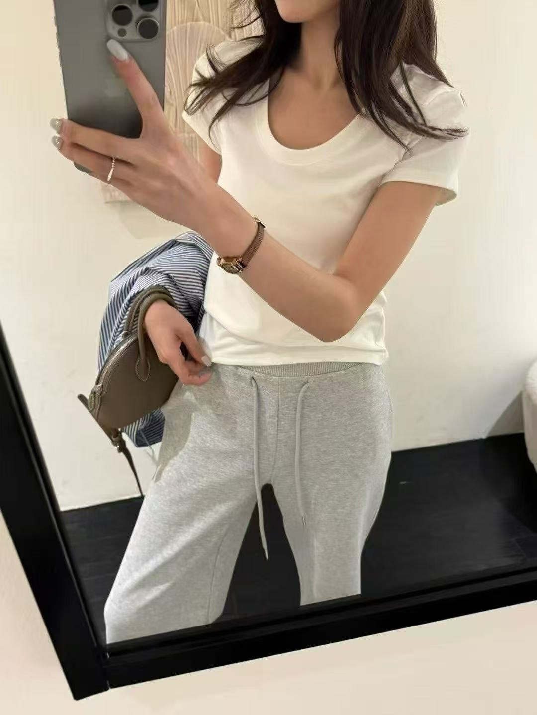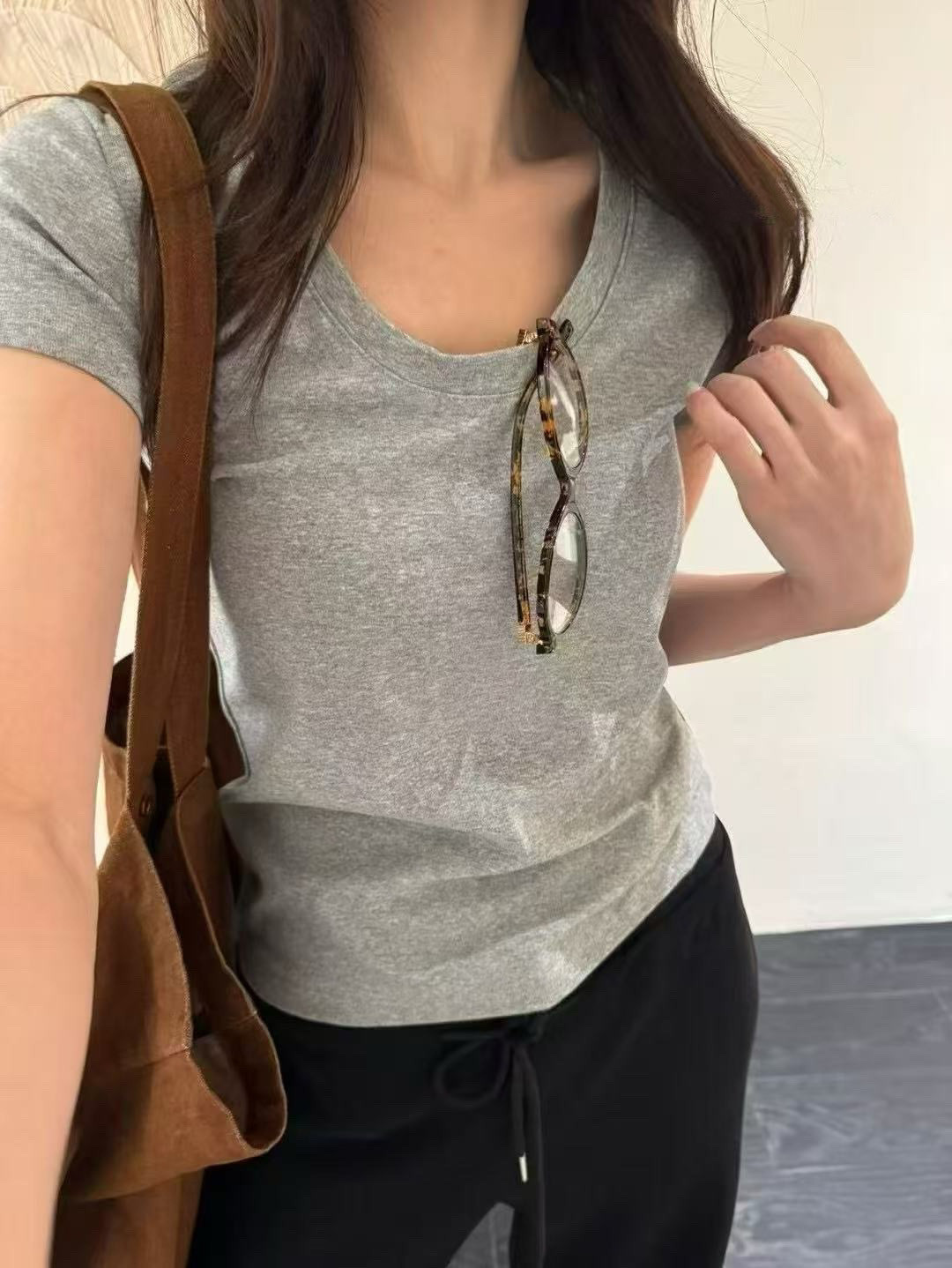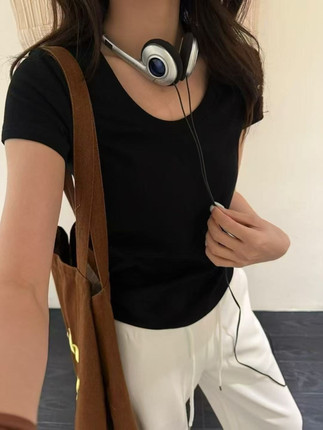 2025新品夏季低领正肩T恤女u领短袖修身棉质内搭大领口上衣