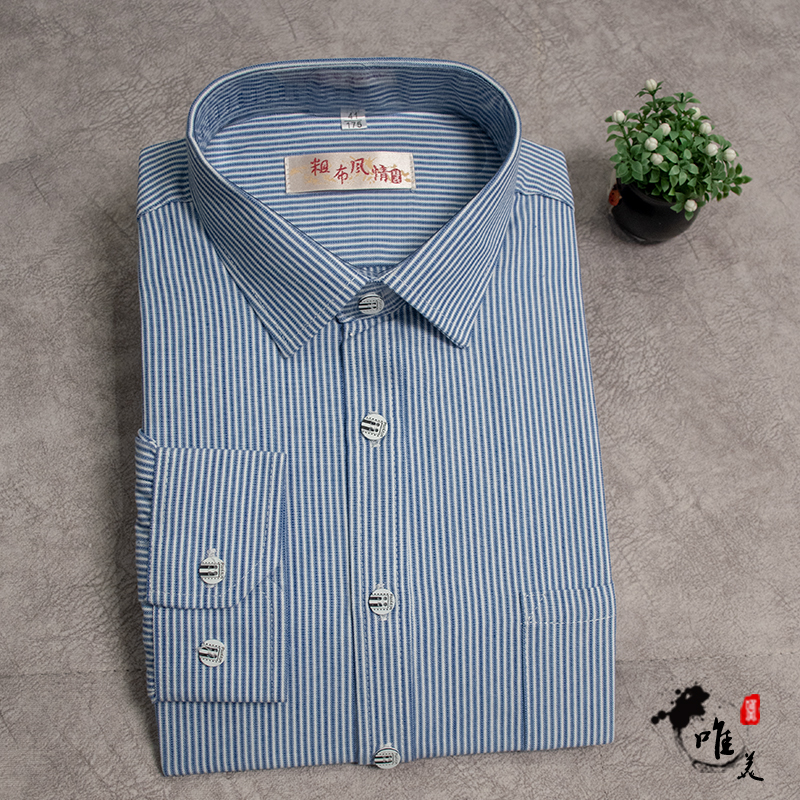 清仓春款纯棉老粗布男士衬衫休闲条纹长袖衬衣全棉格子男装