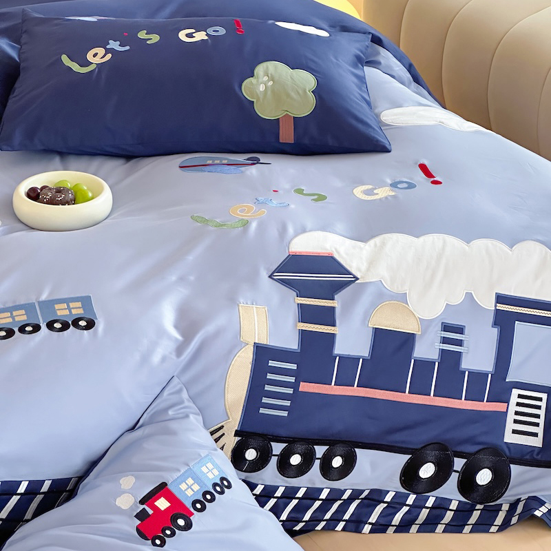 可爱卡通小火车刺绣100支全棉四件套贡缎长绒棉被套床单床上用品