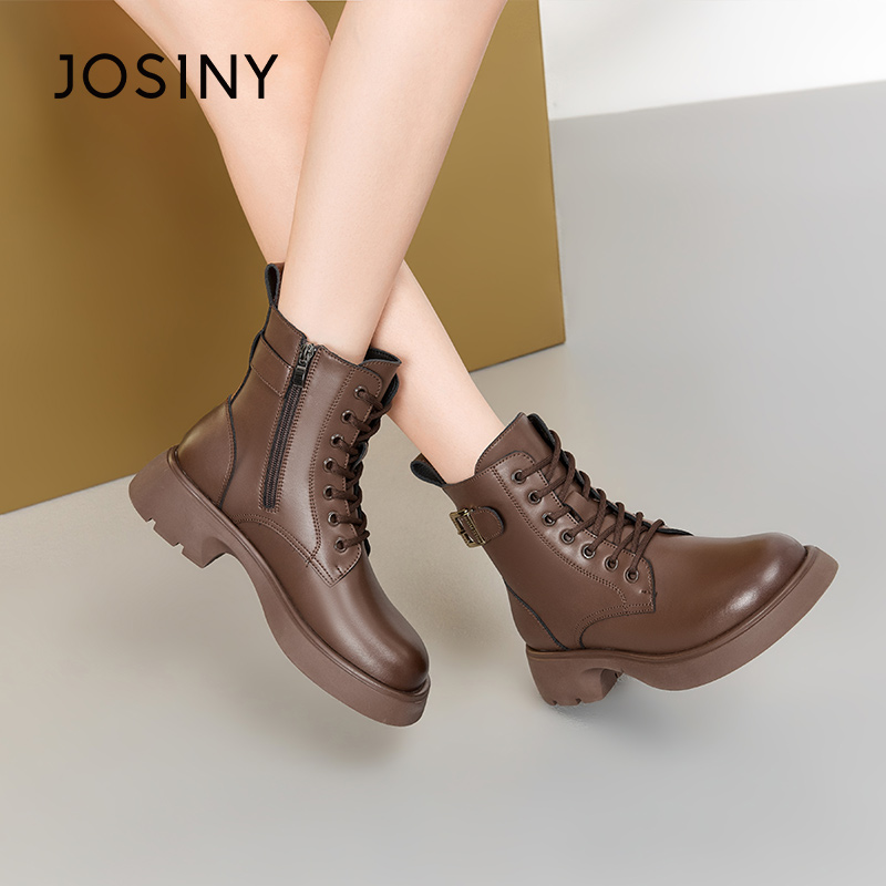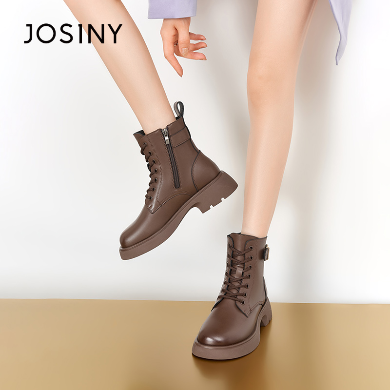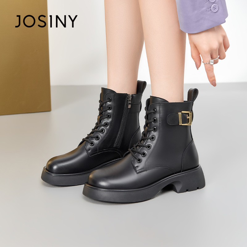 卓诗尼女鞋短筒马丁靴百搭英伦风厚底增高圆头皮带扣装饰显瘦短靴