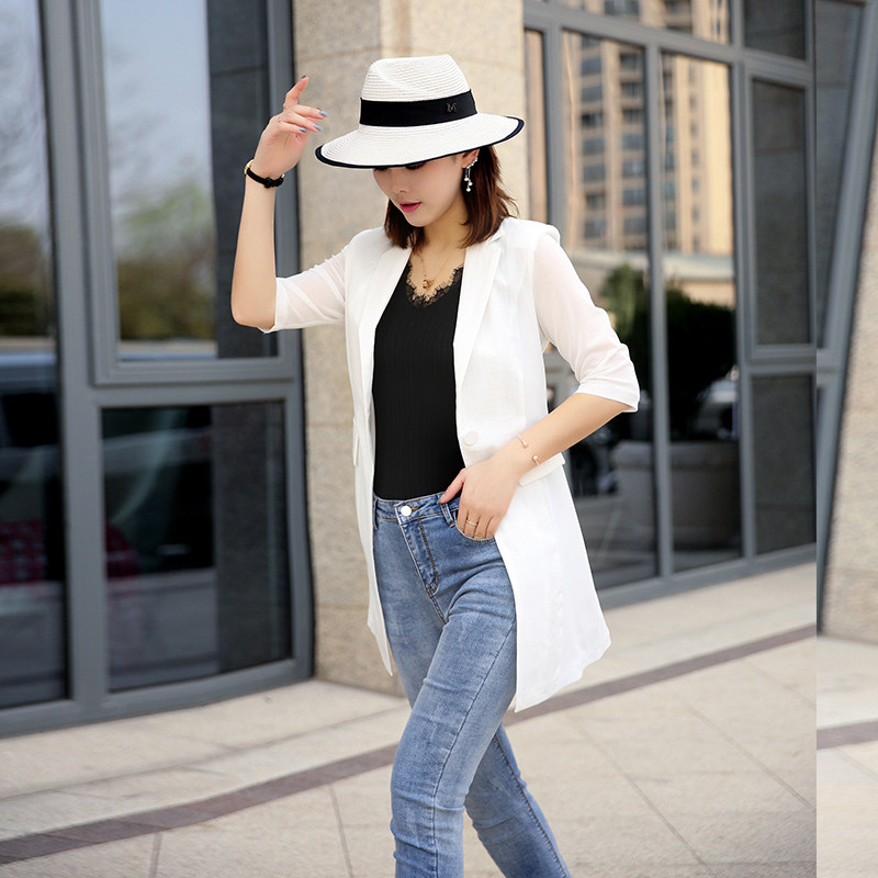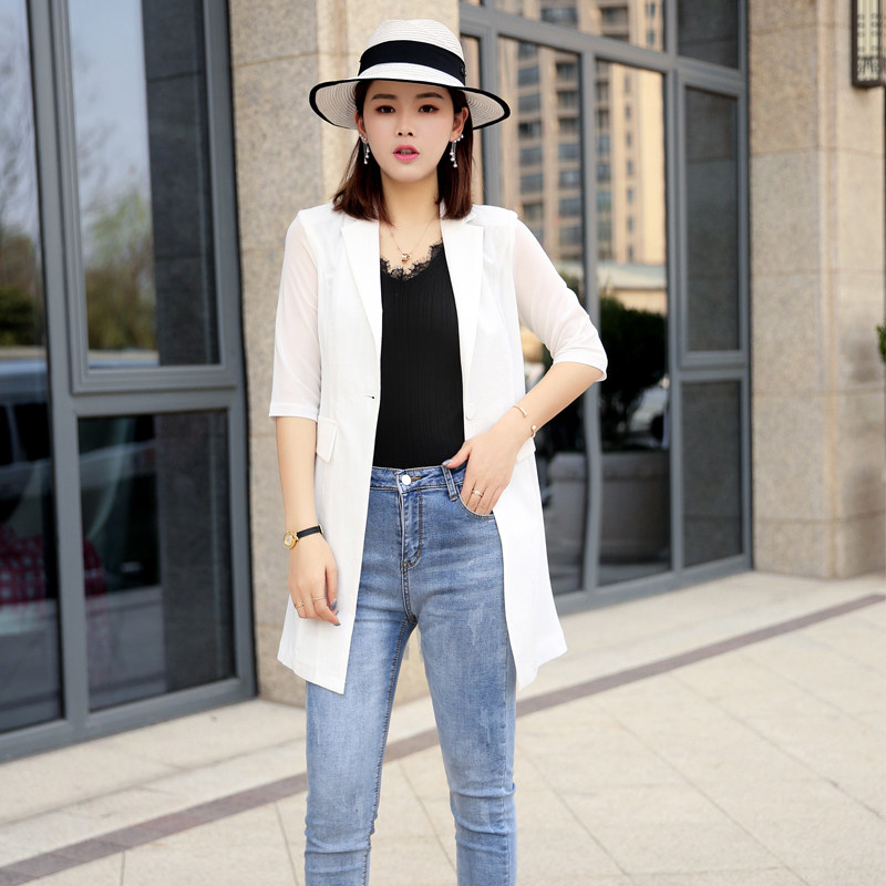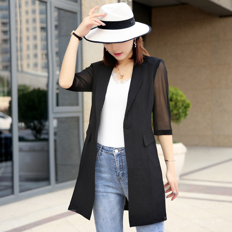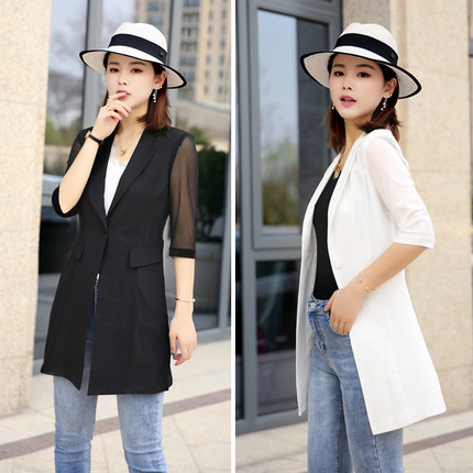 夏季薄款棉麻小西装外套女气质修身显瘦百搭中长款网纱袖防晒上衣