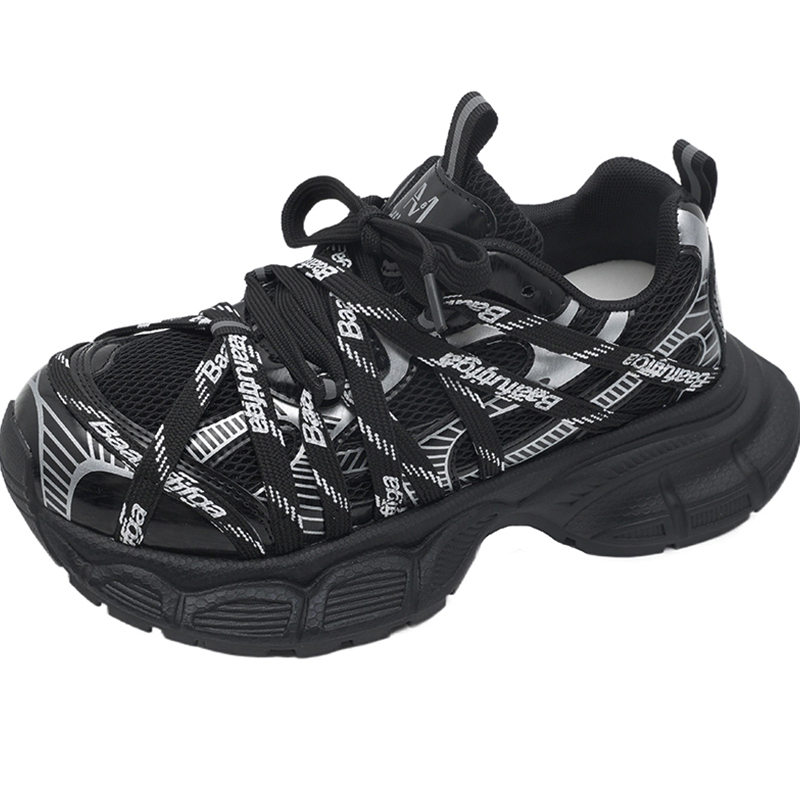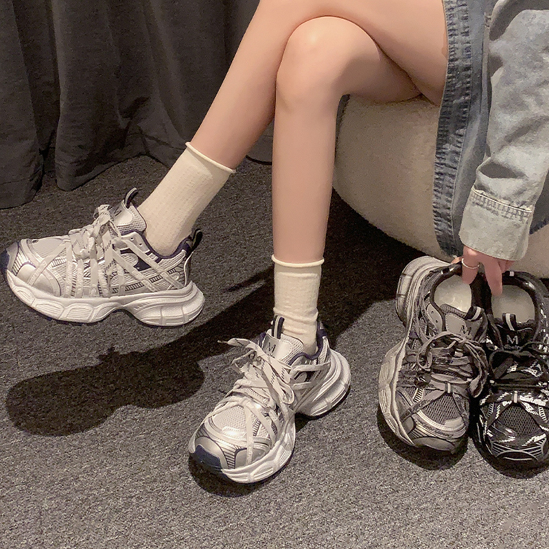 贾不假银色老爹鞋女款2025新款秋季黑色鞋子厚底休闲鞋增高运动鞋