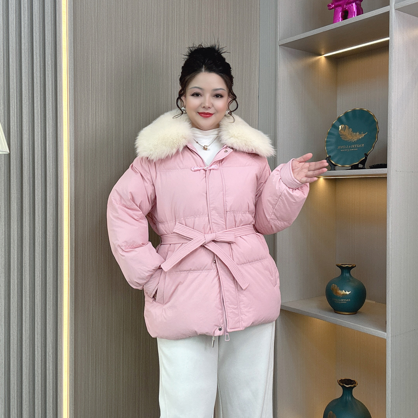 大码胖mm2025新款冬季设计感腰带中式盘扣短款毛领加厚保暖羽绒服