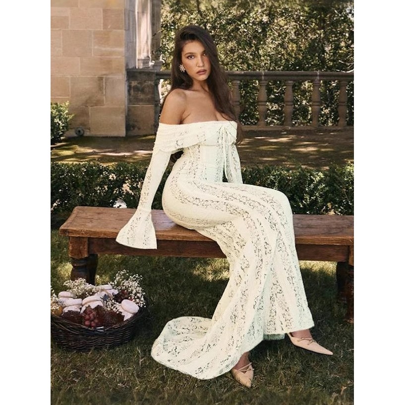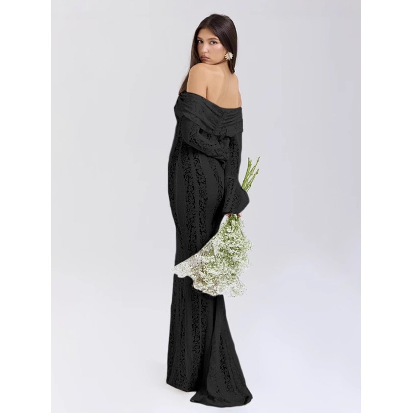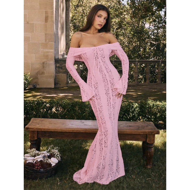 欧美风2024秋冬季新款女装一字领性感长袖露肩蕾丝镂空修身连衣裙