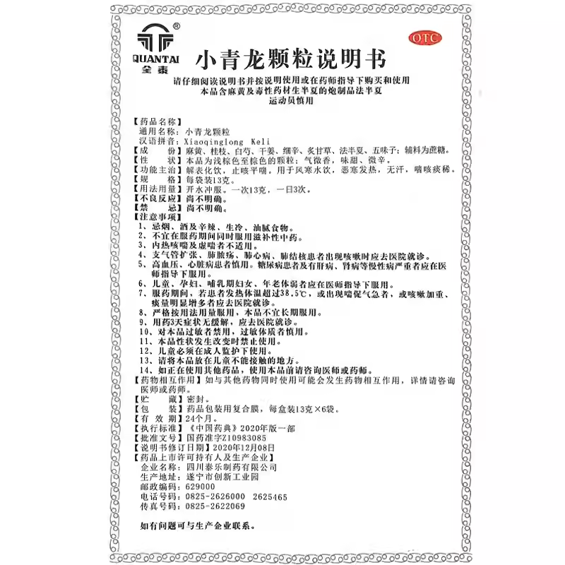 全泰小青龙颗粒13g*6袋/盒冲剂咳嗽发热喘咳痰稀小青龙汤止咳平喘