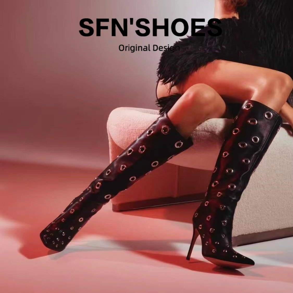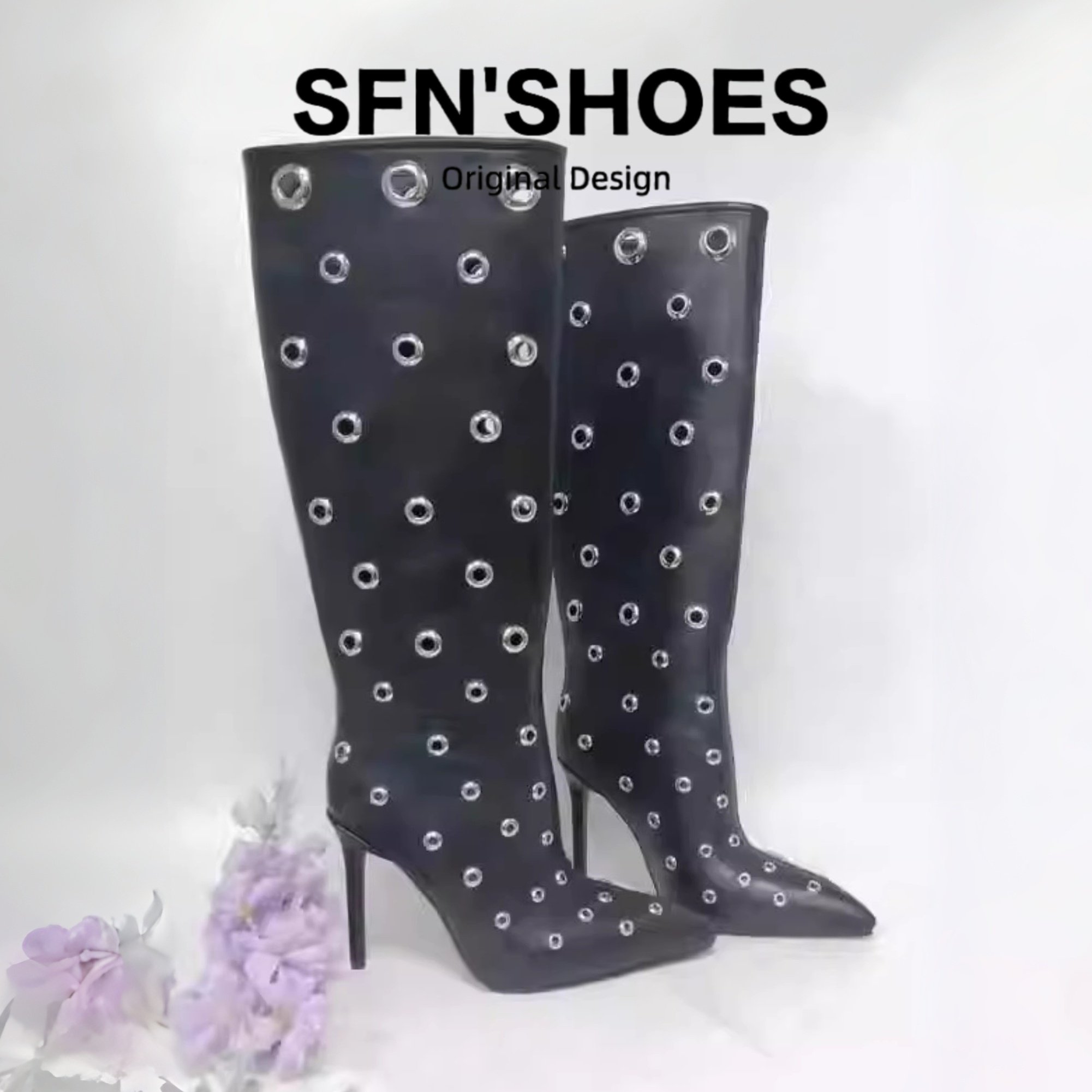 羊皮尖头细跟镂空铆钉高跟长靴女