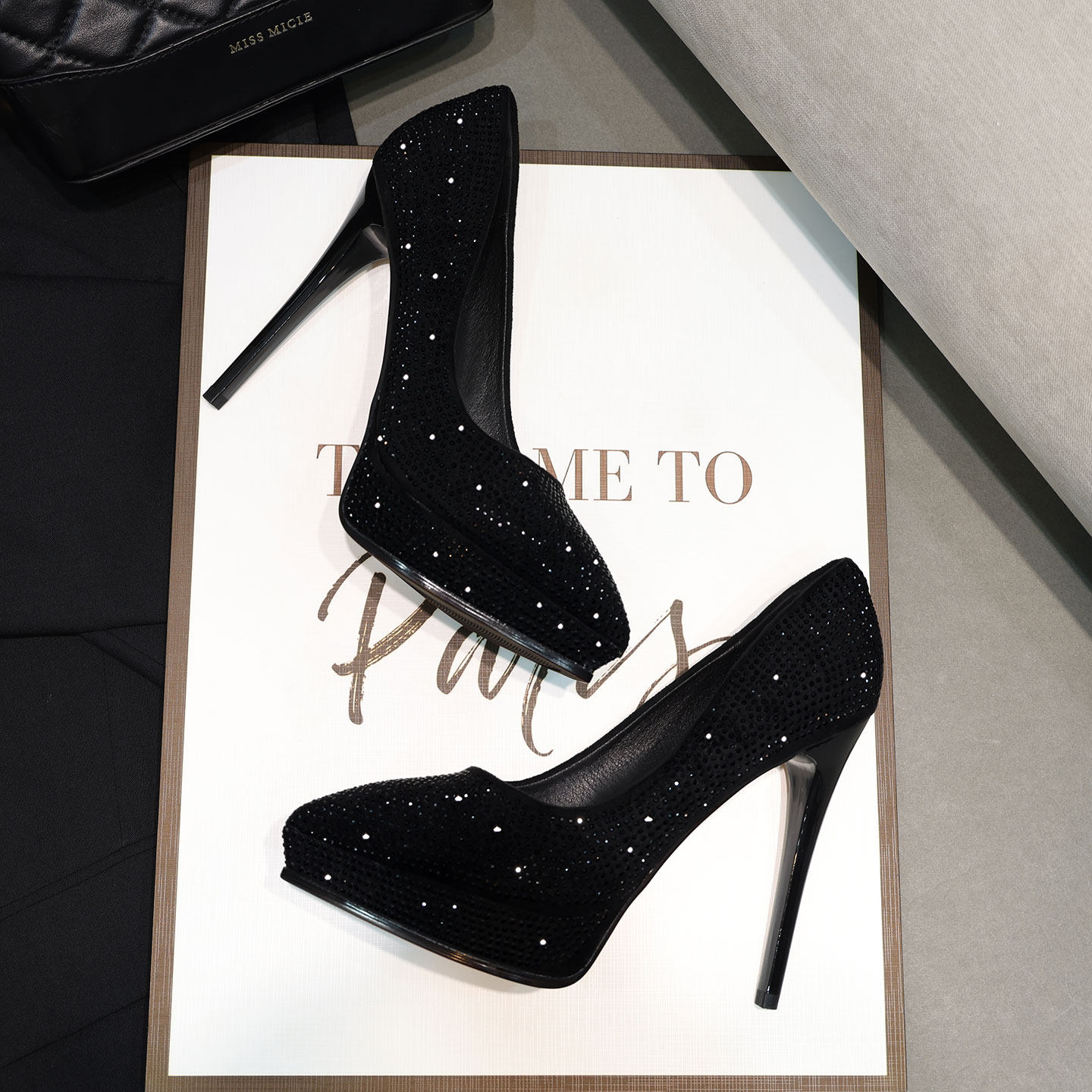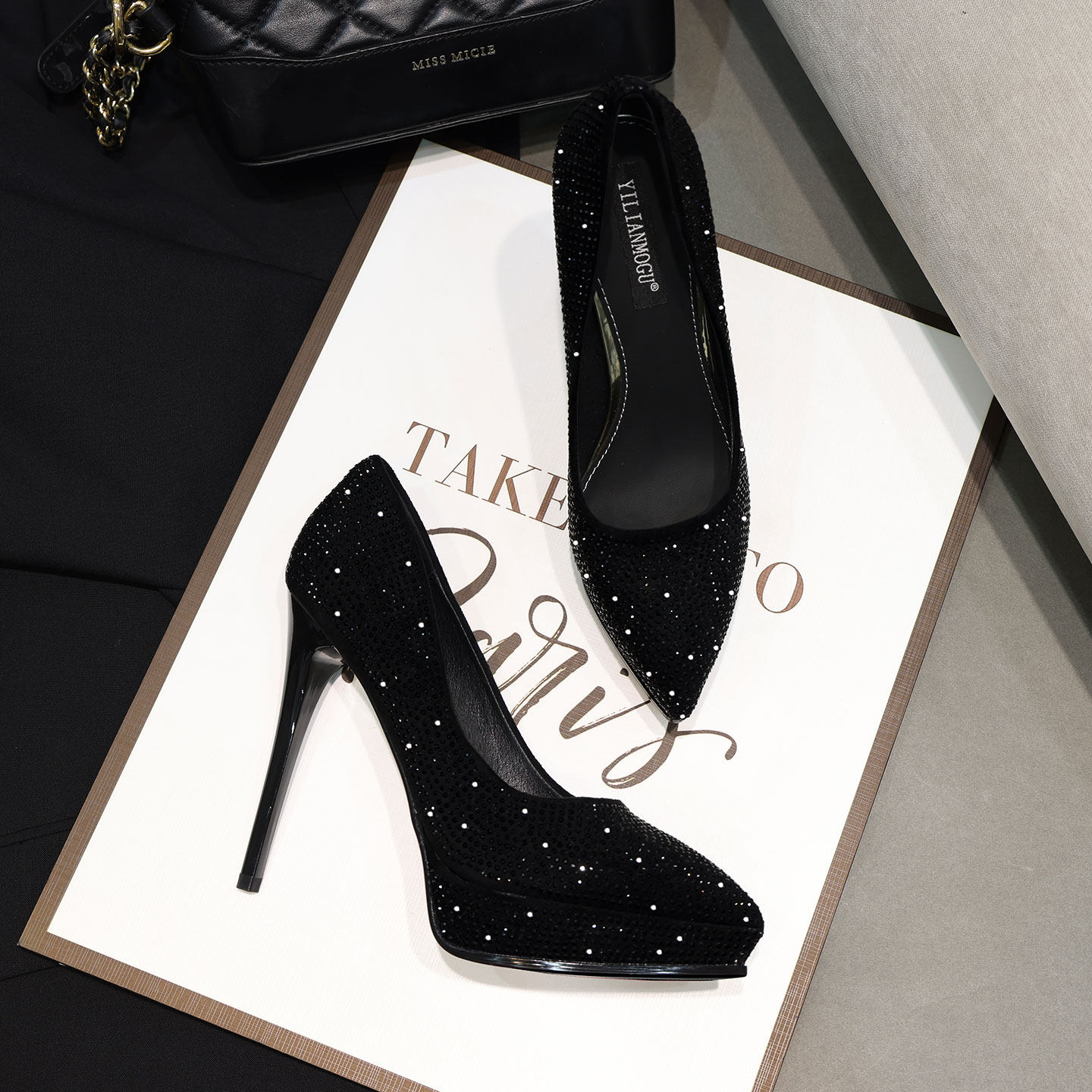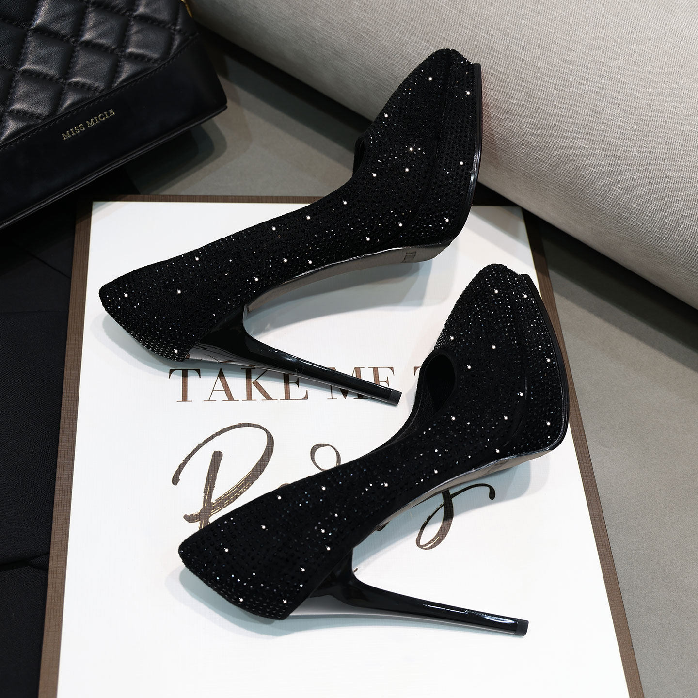 防水台黑色性感水钻水晶尖头细跟超高跟鞋2026新款宴会女单鞋女鞋