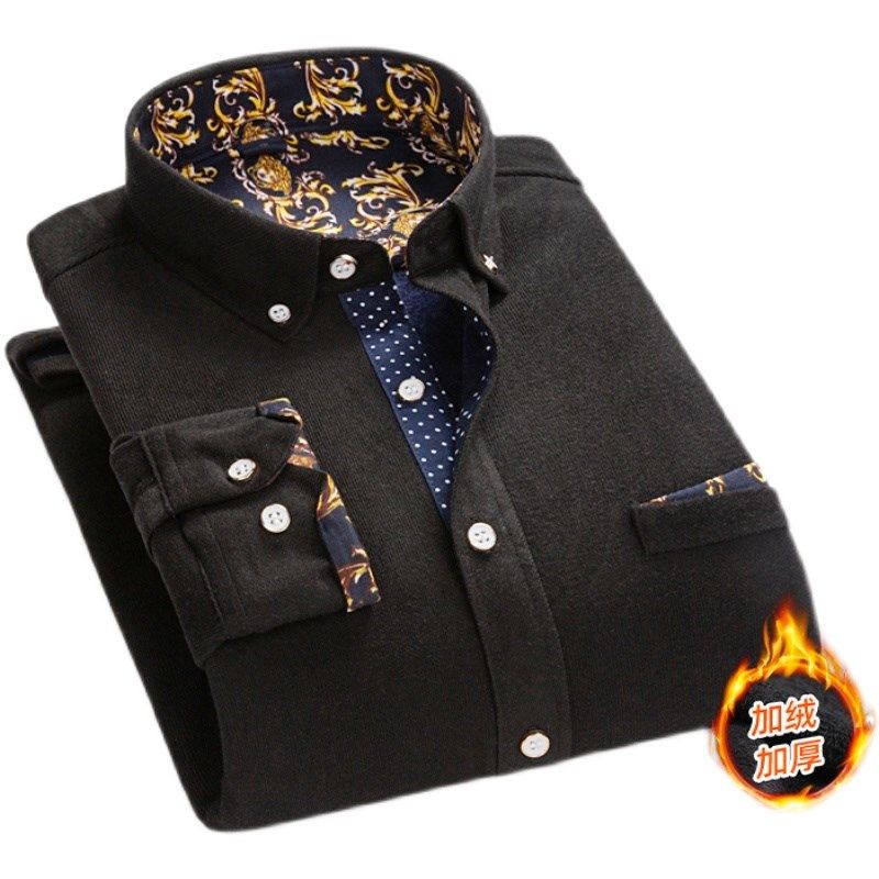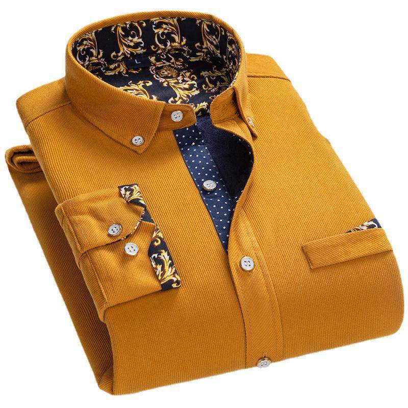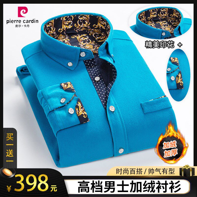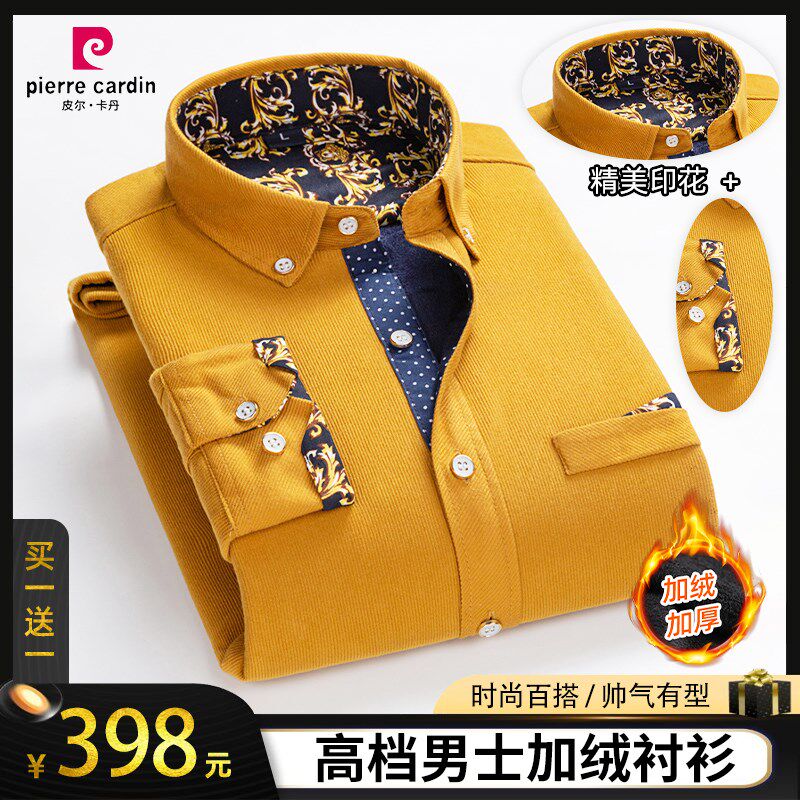 皮尔卡丹秋冬季高档男士加绒印花衬衫商务免烫保暖长袖灯芯绒衬衣