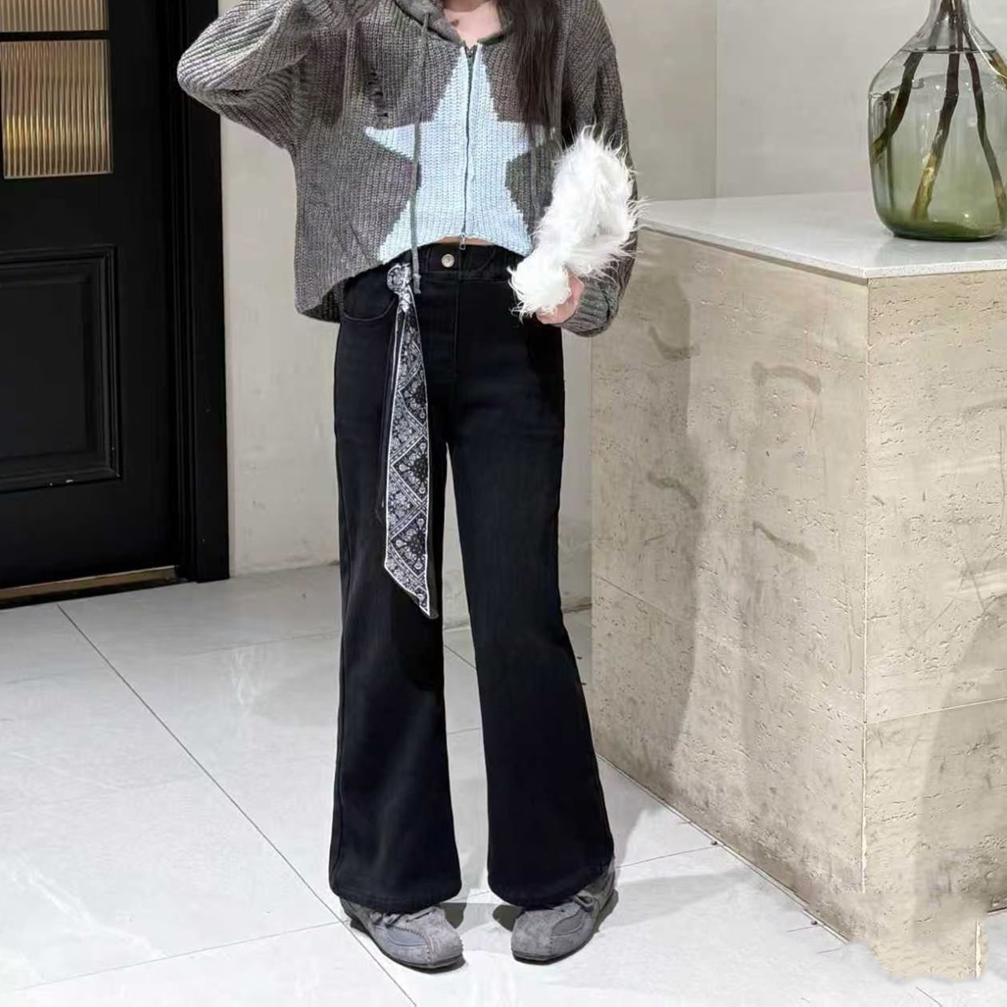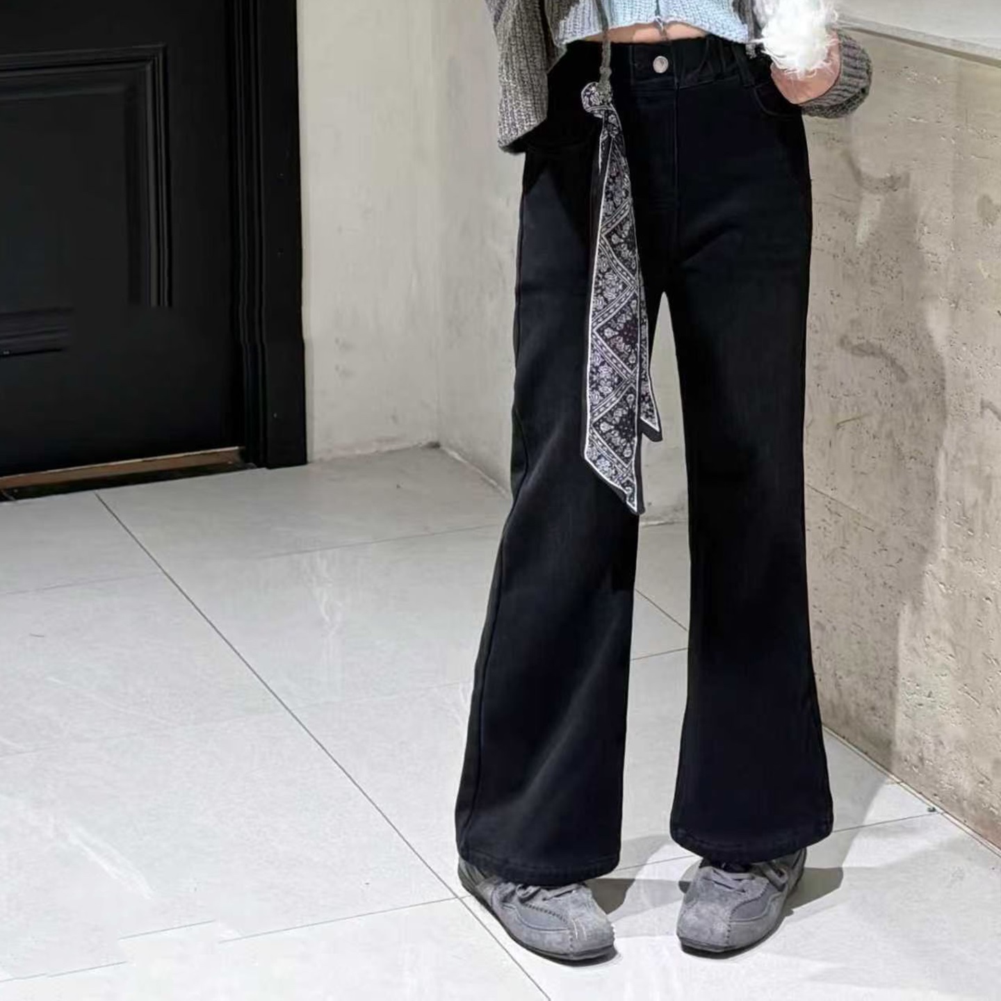 喇叭黑色牛仔裤中大童女童装一体绒秋冬休闲长裤子直筒宽松阔腿潮