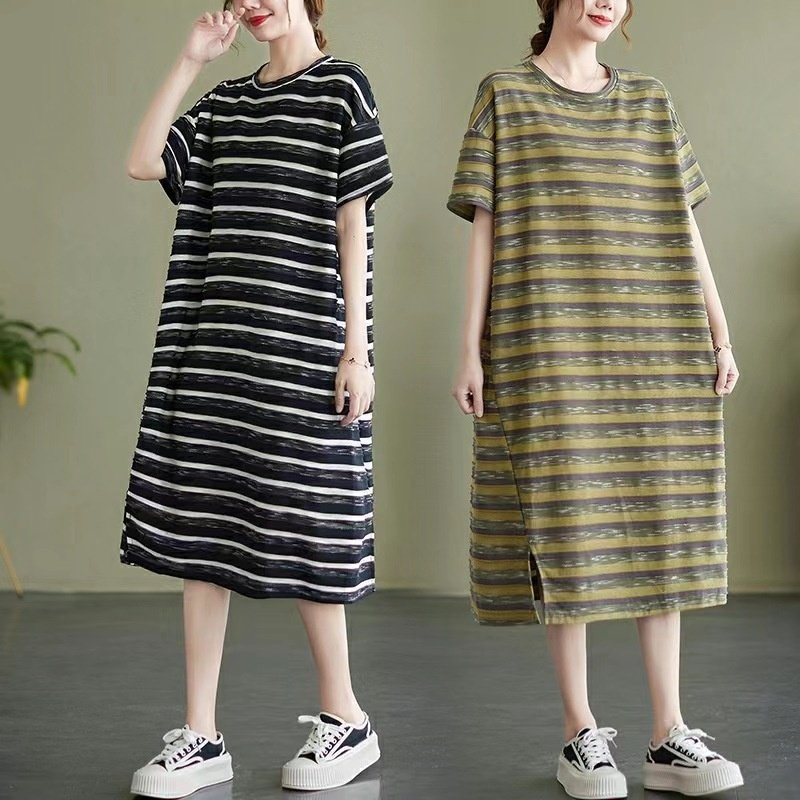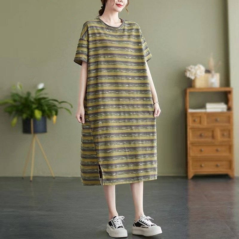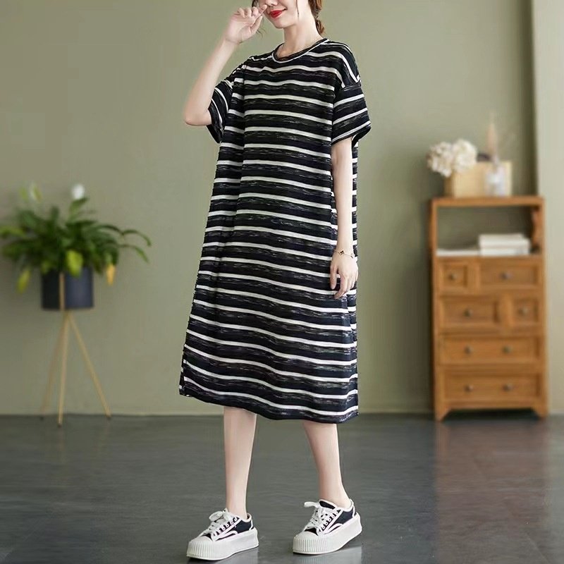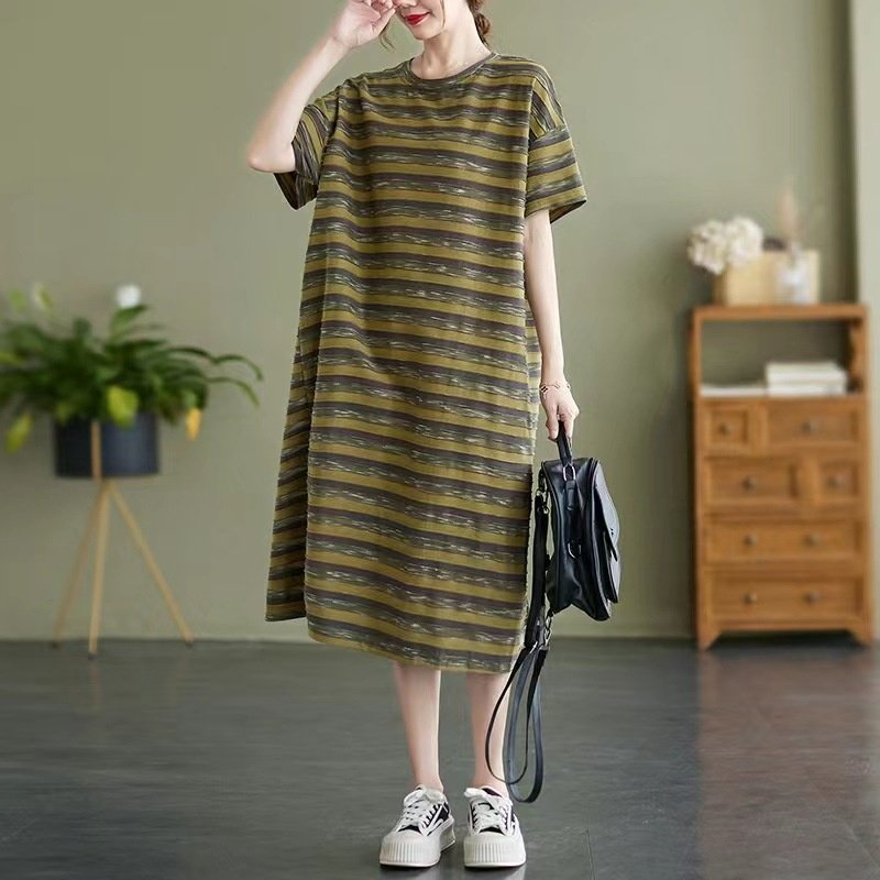 文艺复古条纹连衣裙女夏装新款大码女装宽松遮肉显瘦中长款直