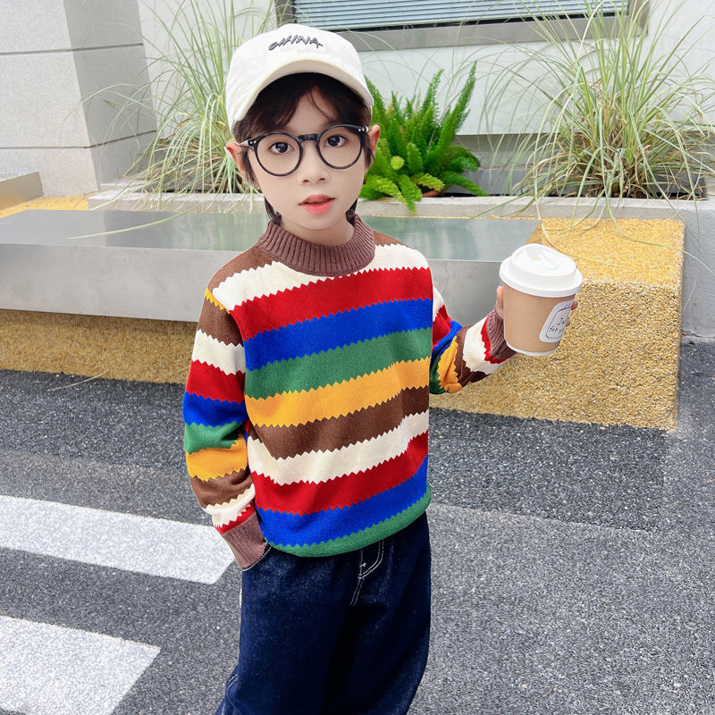 男童女童加绒毛衣针织套头秋冬款加厚打底衫洋气彩条百搭上衣儿童