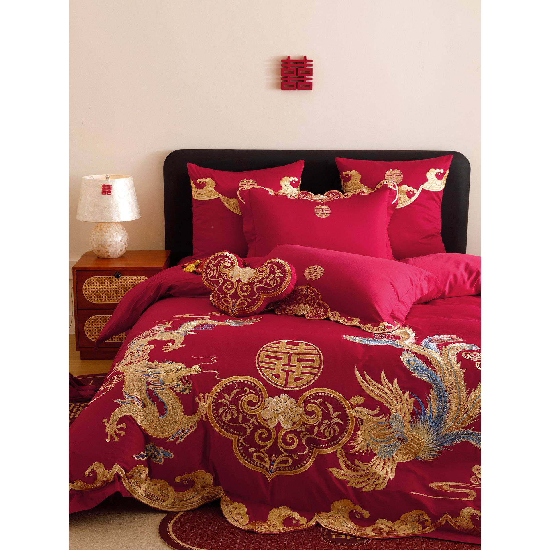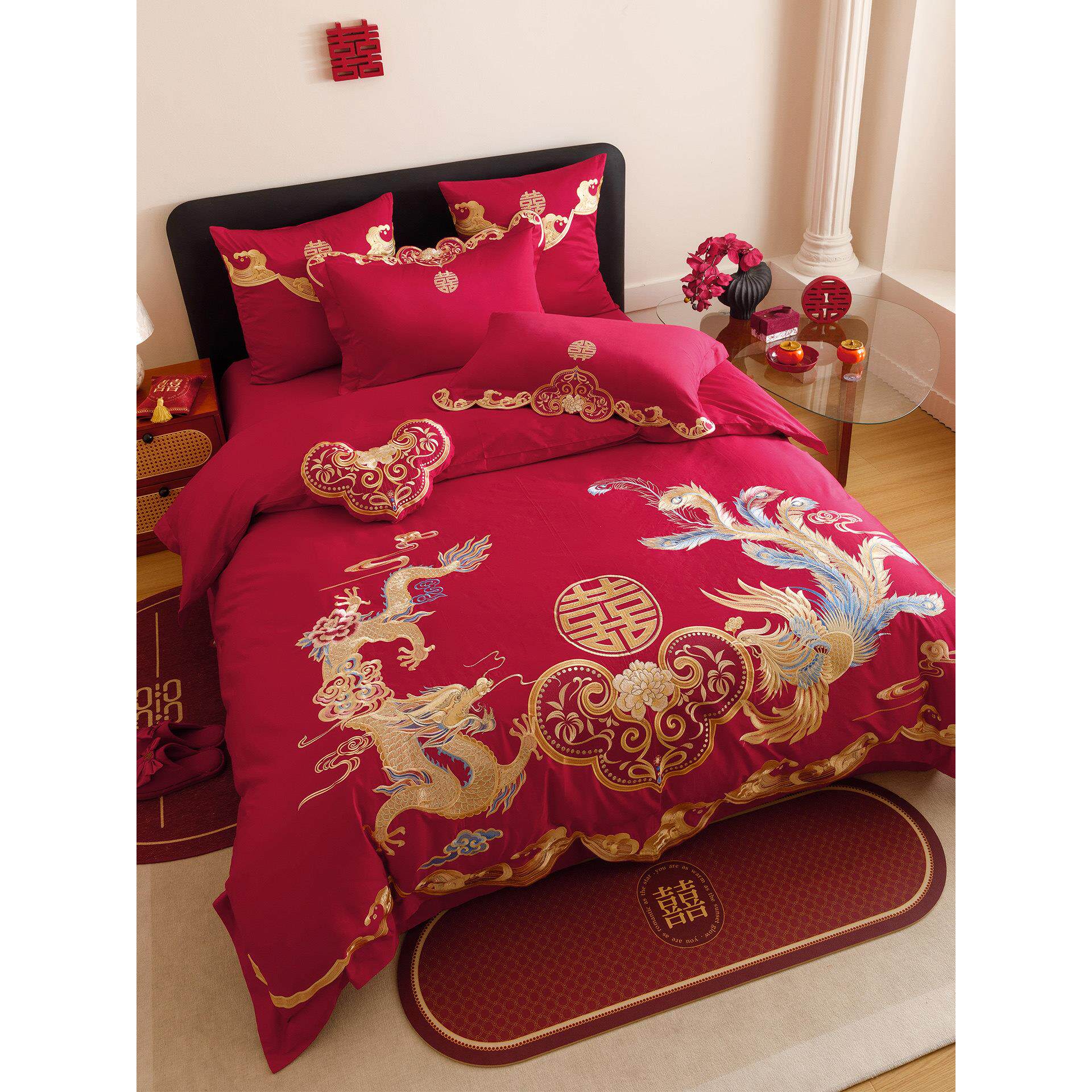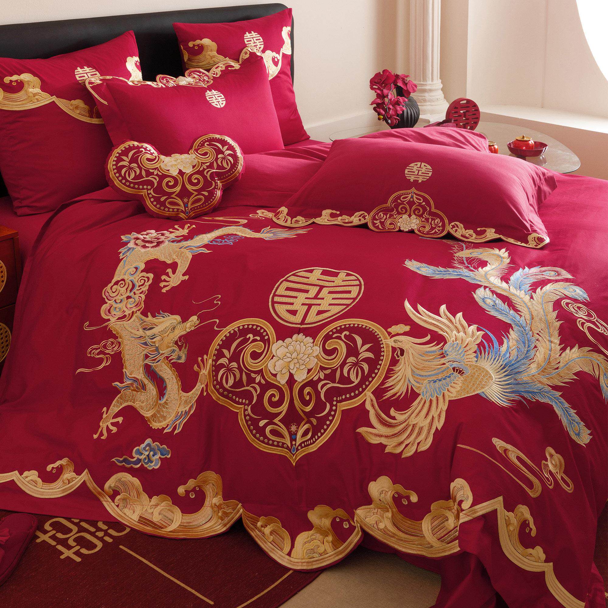 高档中PME式龙凤刺绣婚上庆四件套全棉红大色传统婚被套床单床礼