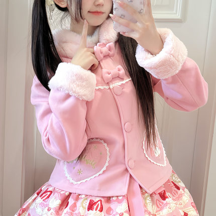 2025秋冬粉色毛绒可爱外套软妹蝴蝶结兔耳连帽短款加厚毛呢外套女