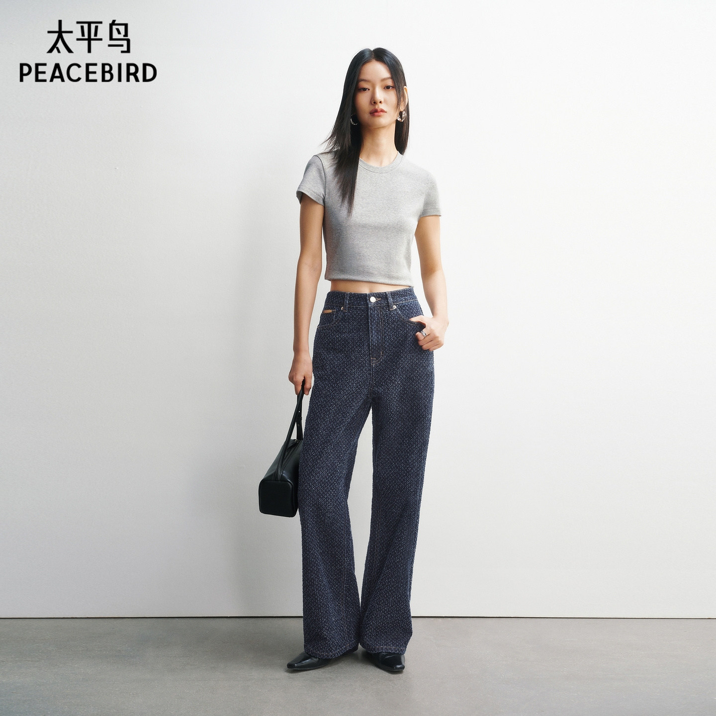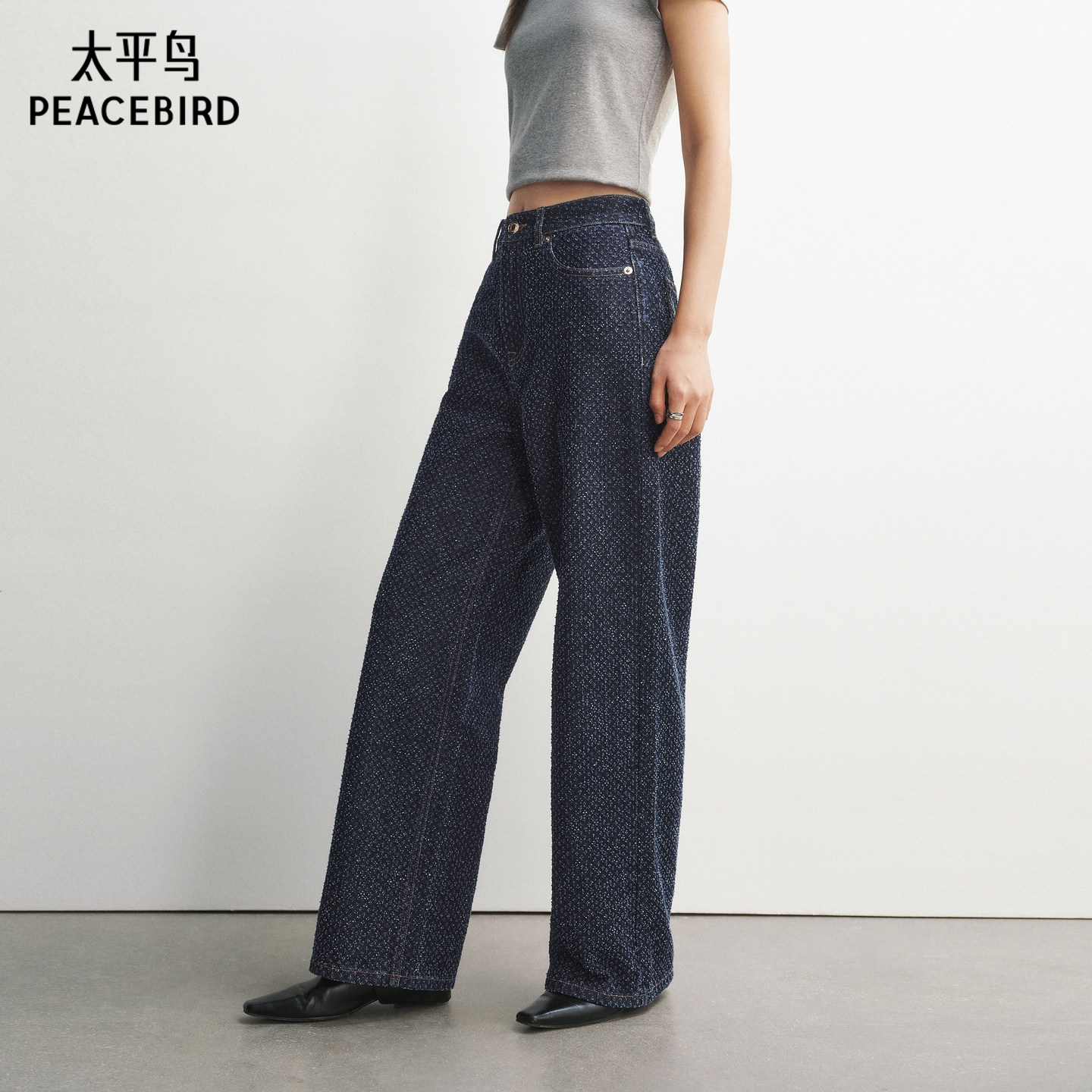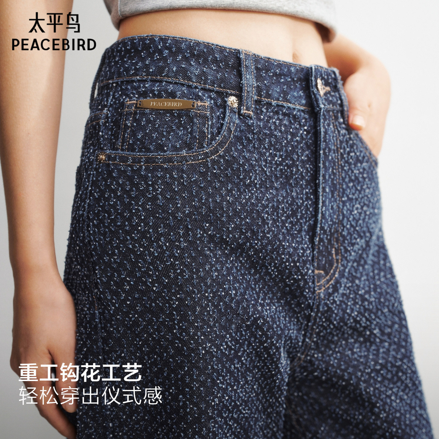 太平鸟小香风钩花阔腿牛仔裤2026年春季新款个性宽松直筒牛仔裤女