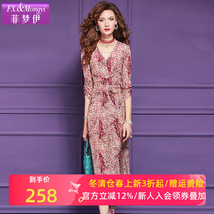 菲梦伊原创100桑蚕丝印花连衣裙女夏装高端褶皱收腰真丝V领长裙子