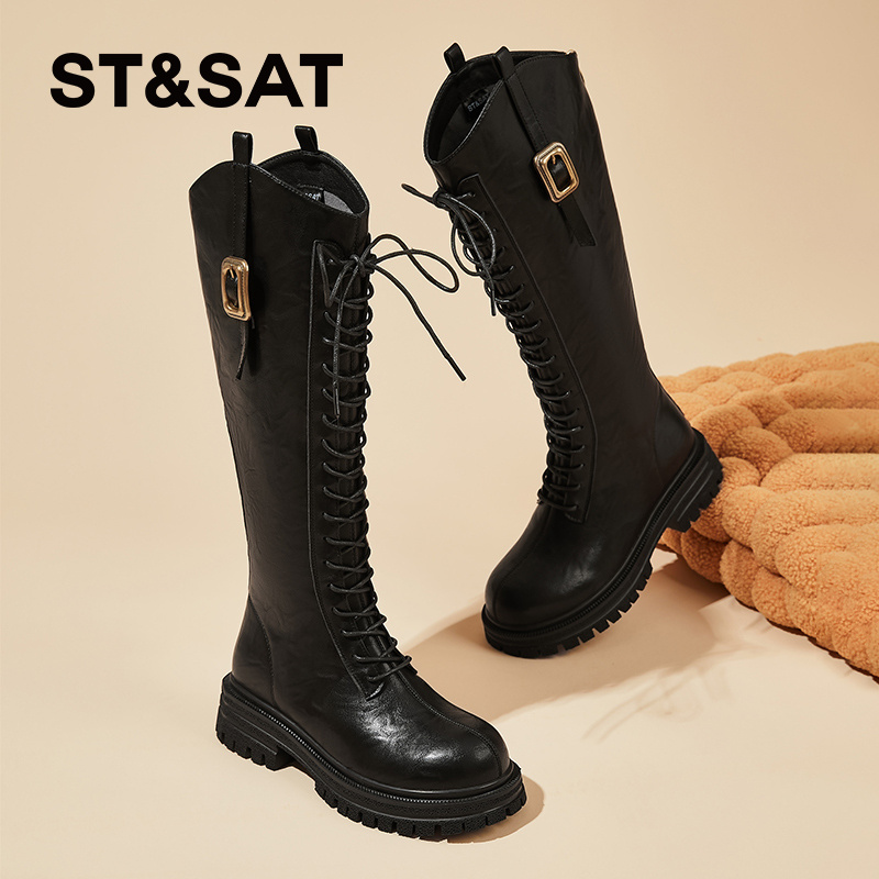 星期六厚底加绒马丁靴女2025秋冬新款高筒系带长靴不过膝骑士靴女