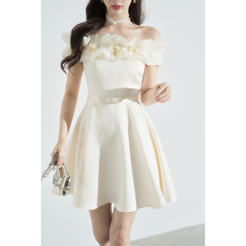 法式气质名媛白色一字肩连衣裙女夏季高级感收腰显瘦蓬蓬小礼裙子