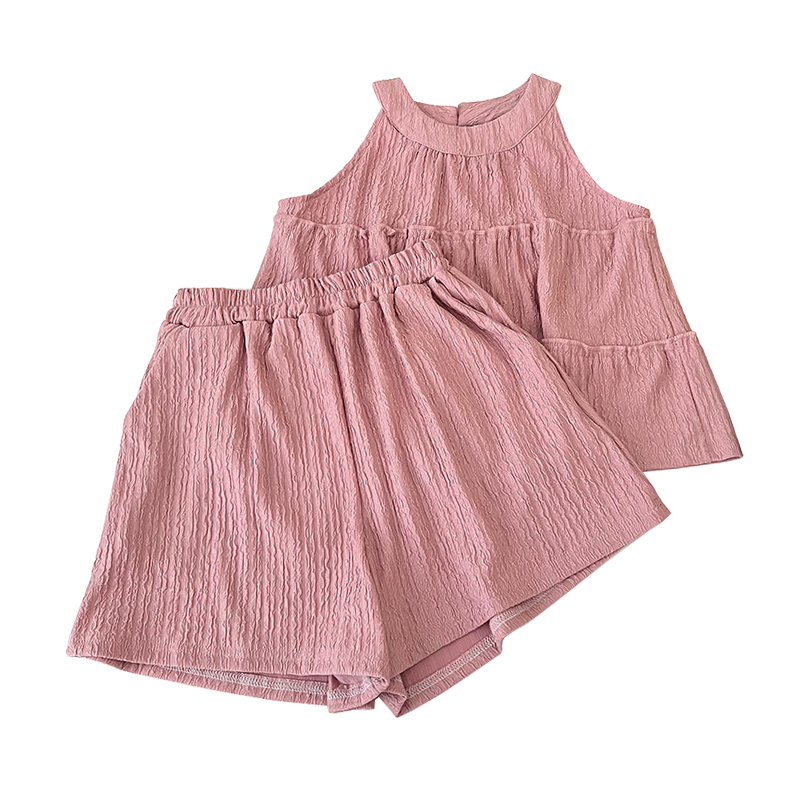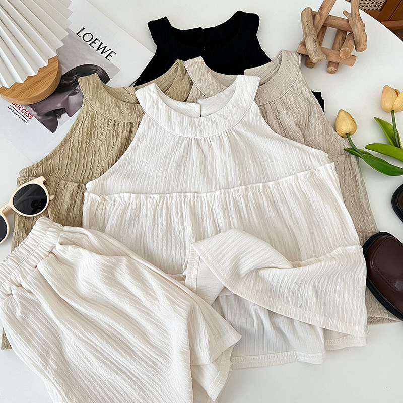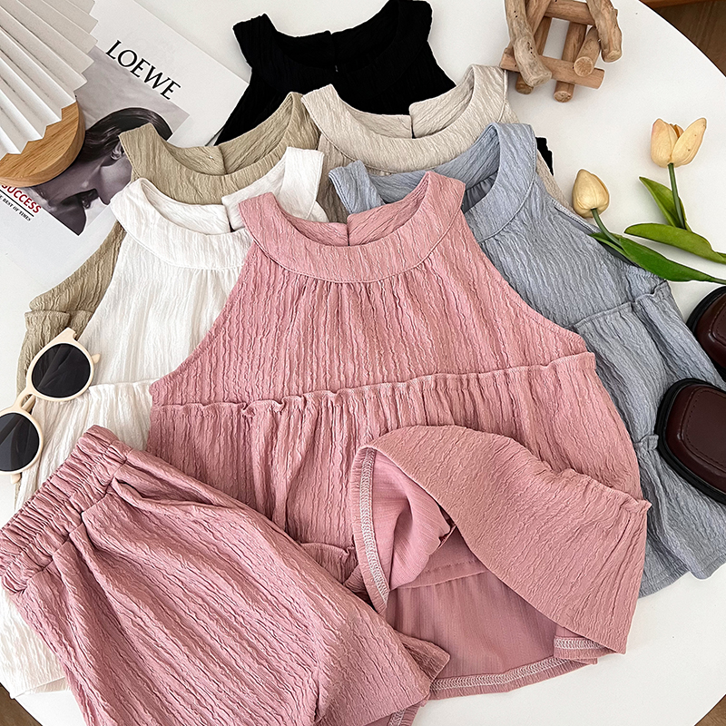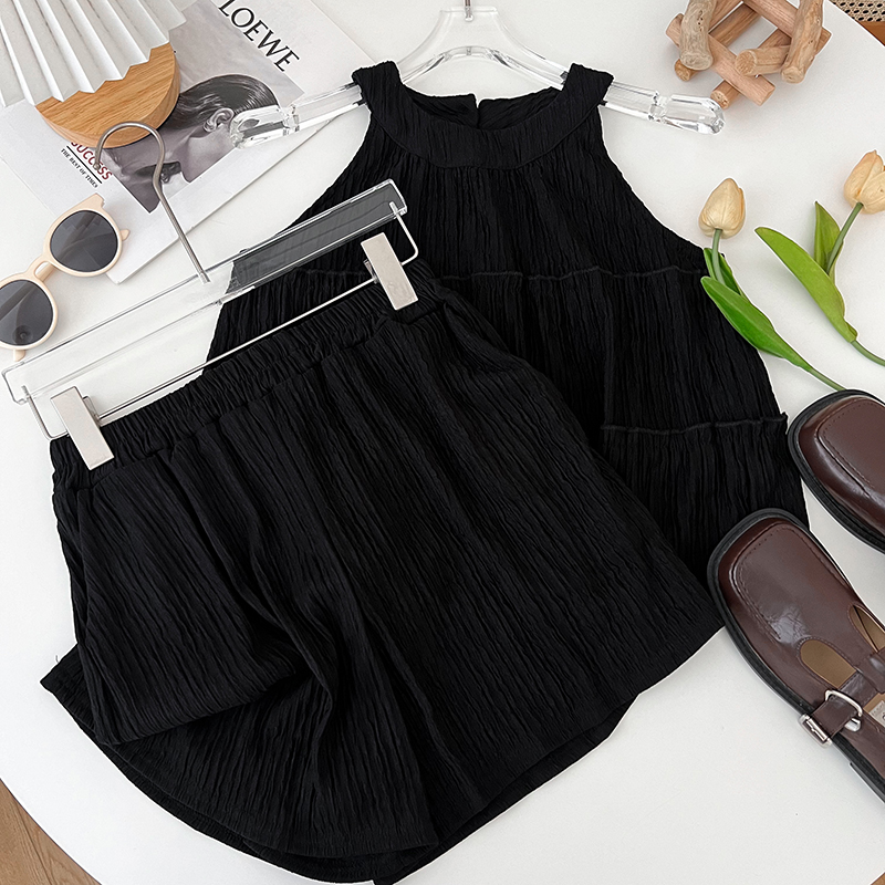 甜美减龄挂脖木耳荷叶边无袖背心上衣+松紧腰阔腿裤短裤两件套女