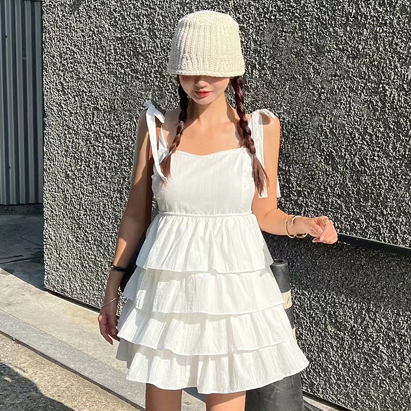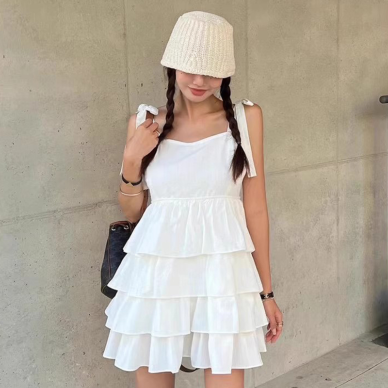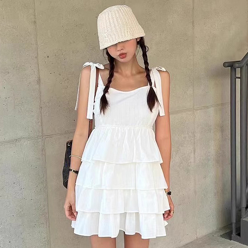 法式甜美吊带连衣裙女夏季新款少女风拼接收腰显瘦白色减龄蛋糕裙