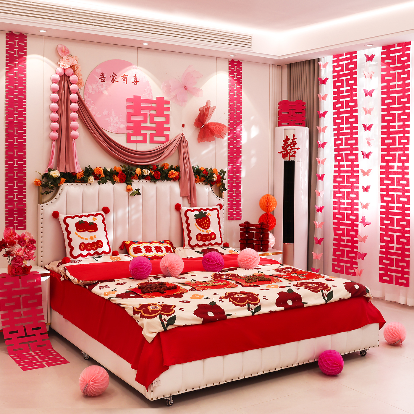 结婚用品喜字贴床头装饰婚房布置套装女方卧室蝴蝶拉花创意背景墙