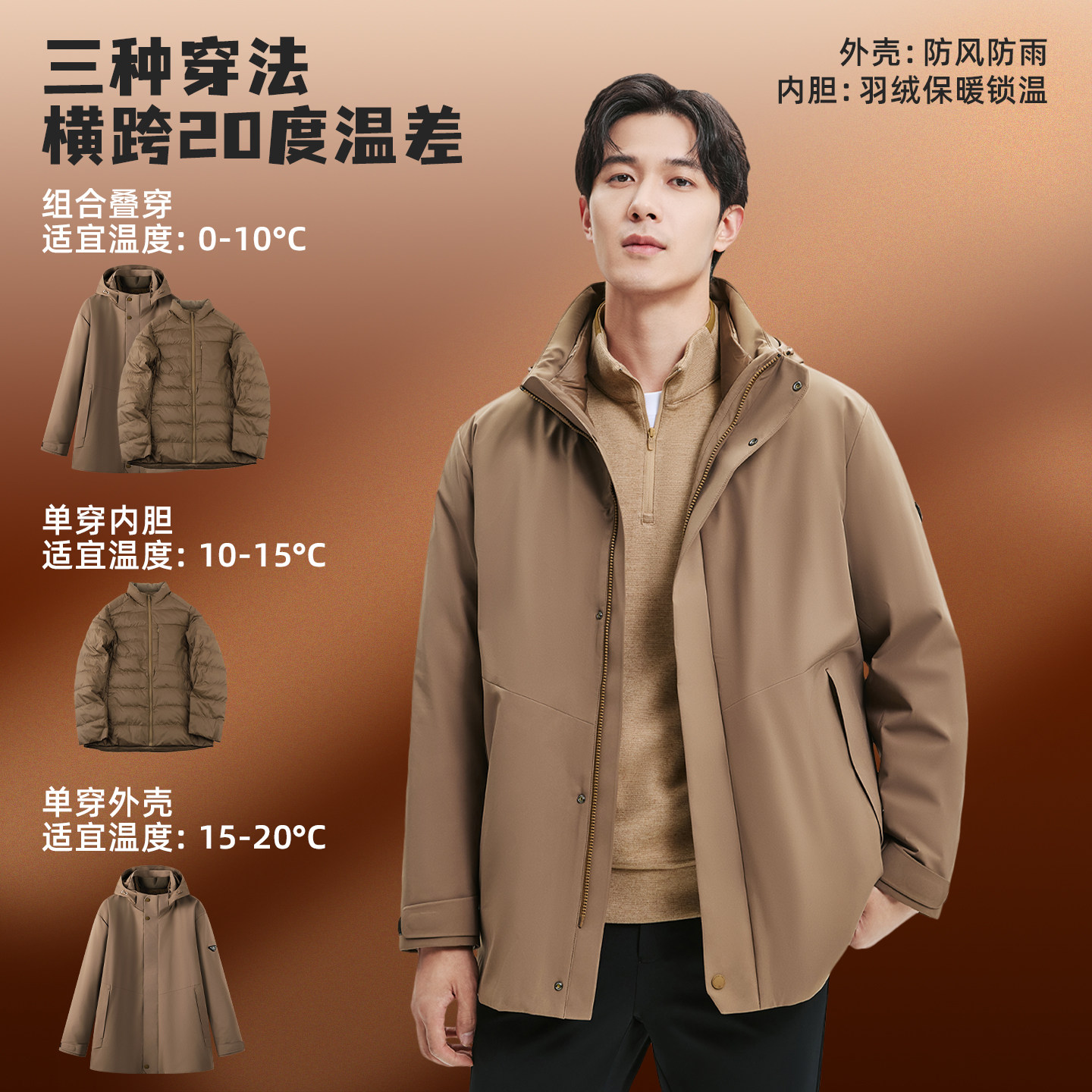 七匹狼连帽三合一两件套羽绒服男