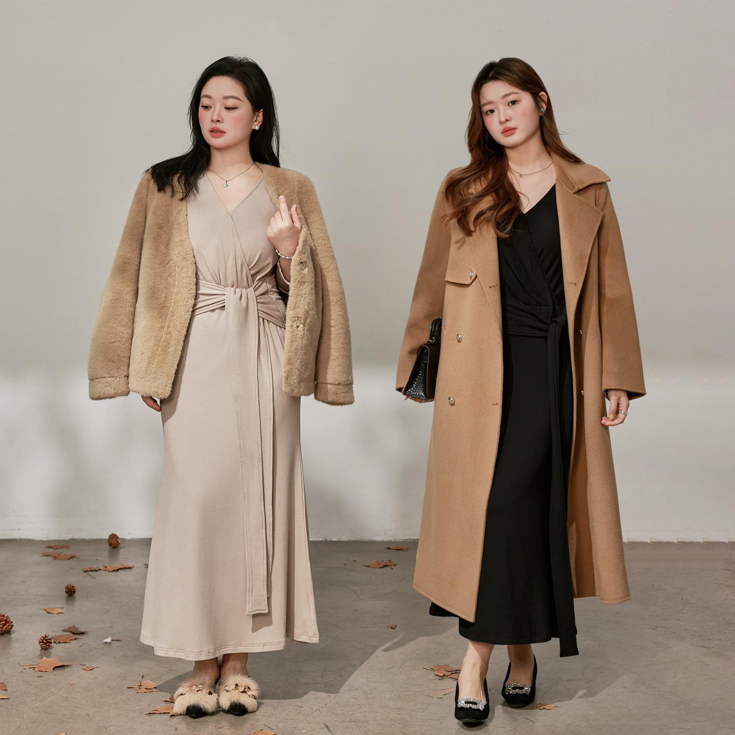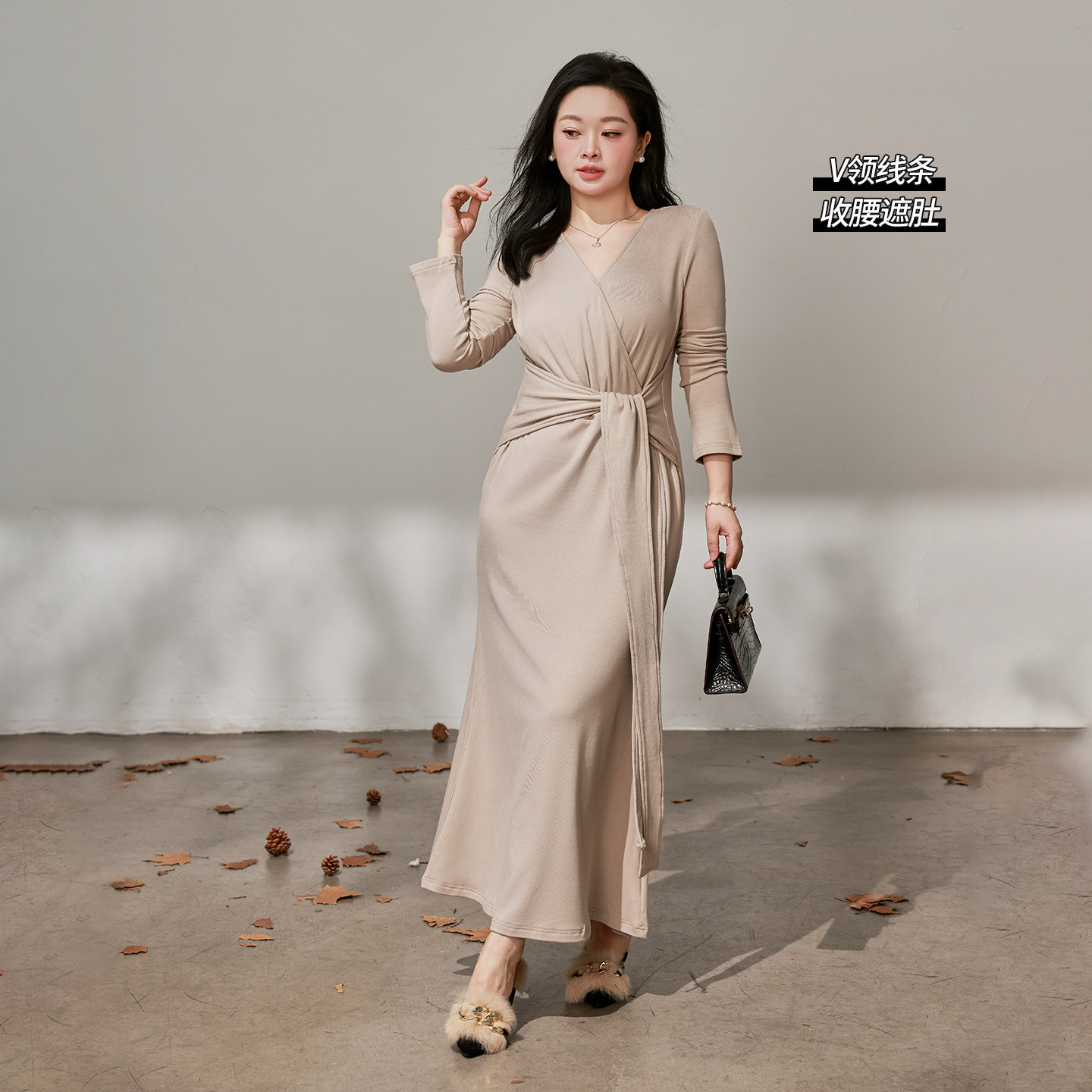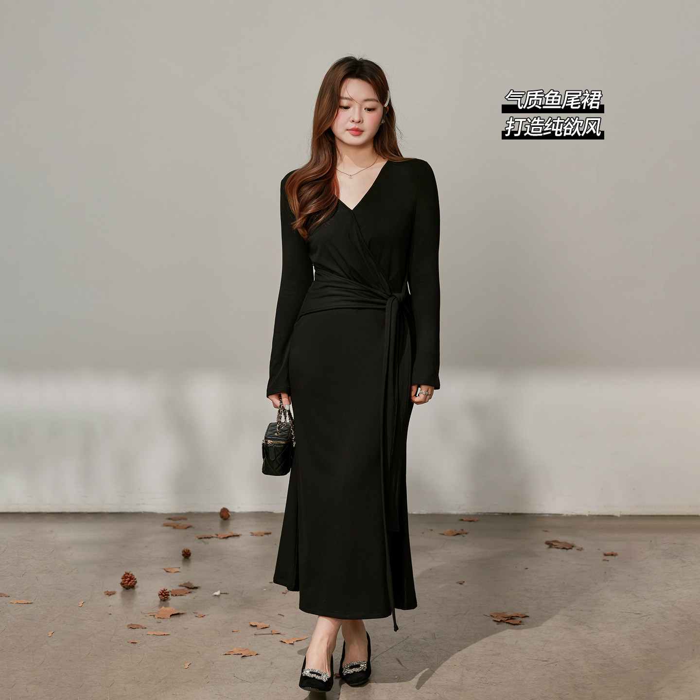 DM100大码百分百女装微胖mm冬季纯欲V领系带收腰修身鱼尾连衣裙